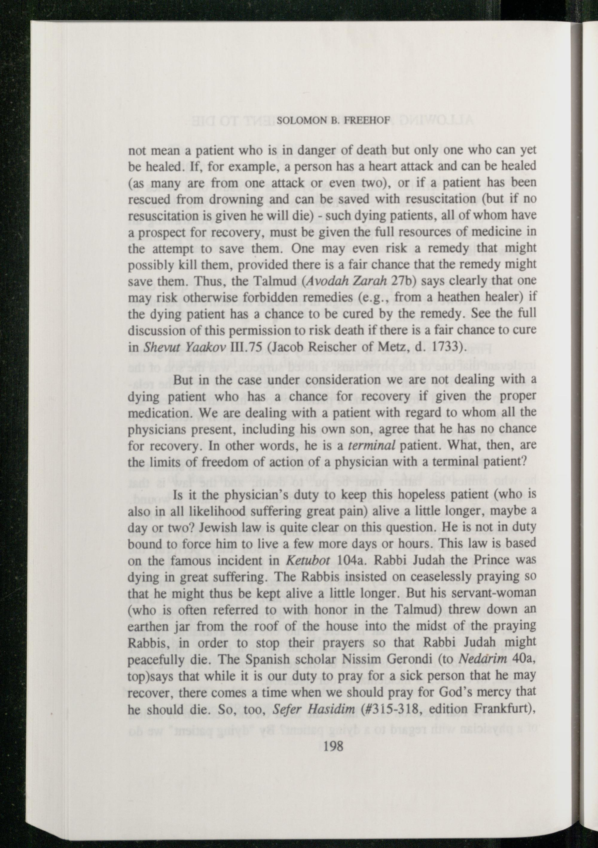 Is it the physician’s duty to keep this hopeless patient(who is also in all likelihood suffering great pain) alive a little longer, maybe a day or two? Jewish law is quite clear on this question. He is not in duty bound to force him to live a few more days or hours. This law is based on the famous incident in Ketubot 104a. Rabbi Judah the Prince was dying in great suffering. The Rabbis insisted on ceaselessly praying so that he might thus be kept alive a little longer. But his servant-woman (who is often referred to with honor in the Talmud ) threw down an earthen jar from the roof of the house into the midst of the praying Rabbis , in order to stop their prayers so that Rabbi Judah might peacefully die. The Spanish scholar Nissim Gerondi (to Neddrim 40a, top)says that while it is our duty to pray for a sick person that he may recover, there comes a time when we should pray for God ’s mercy that he should die. So, too, Sefer Hasidim(#315-318, edition Frankfurt ),