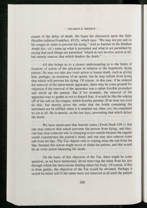 All this brings us to a clearer understanding as to the limits of freedom of action of the physician in relation to the hopelessly dying patient. He may not take any overt action to hasten death, such as giving him, perhaps, an overdose of an opiate, but he may refrain from doing that which will prevent his dying. Of course, in this case, if he ordered the removal of the intravenous apparatus, there may be some ground for objection if the removal of the apparatus was a rather forcible procedure and shook up the patient. But if for example, the removal of the apparatus was so gentle as not to disturb him, it would be like the wiping off of the salt on his tongue, which Isserles permits. If he does not even