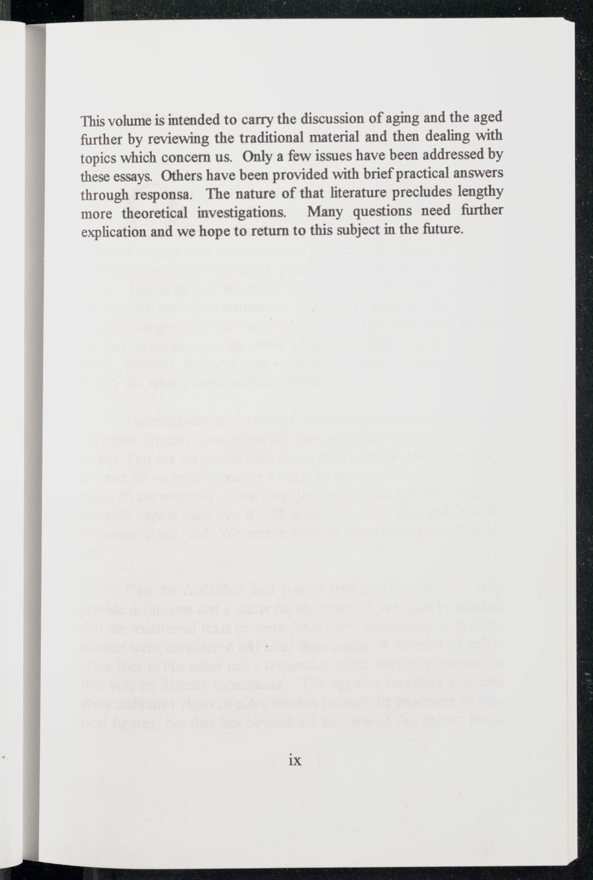 This volume is intended to carry the discussion of aging and the aged further by reviewing the traditional material and then dealing with topics which concern us. Only a few issues have been addressed by these essays. Others have been provided with brief practical answers through responsa. The nature of that literature precludes lengthy more theoretical investigations. Many questions need further explication and we hope to return to this subject in the future.