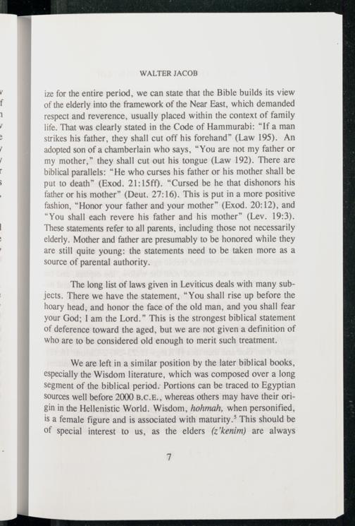We are left in a similar position by the later biblical books, especially the Wisdom literature, which was composed over a long segment of the biblical period. Portions can be traced to Egyptian sources well before 2000 B.C.E., whereas others may have their origin in the Hellenistic World. Wisdom, hohmah, when personified, is a female figure and is associated with maturity.® This should be of special interest to us, as the elders(z’kenim) are always