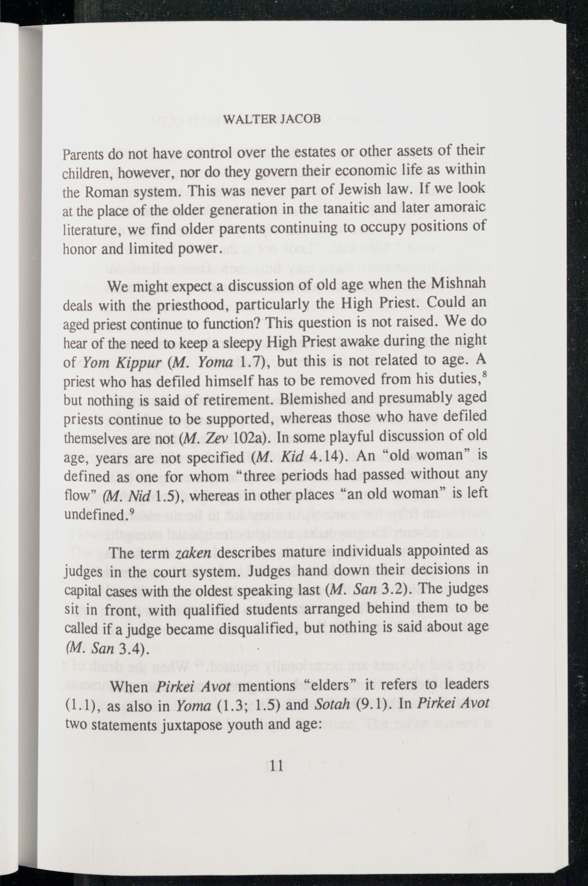 Parents do not have control over the estates or other assets of their children, however, nor do they govern their economic life as within the Roman system. This was never part of Jewish law. If we look at the place of the older generation in the tanaitic and later amoraic literature, we find older parents continuing to occupy positions of honor and limited power.