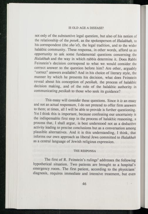 This essay will consider these questions. Since it is an essay and not an actual responsum, I do not pretend to offer firm answers to them; at times, all I will be able to provide is further questioning. Yet I think this is important, because confessing our uncertainty is the indispensable first step in the process of halakhic reasoning, a process that, I shall argue, is best understood not as a deductive activity leading to precise conclusions but as a conversation among plausible alternatives. And it is this understanding, I think, that informs our own approach as liberal Jews committed to Halakhah as a central language of Jewish religious expression.