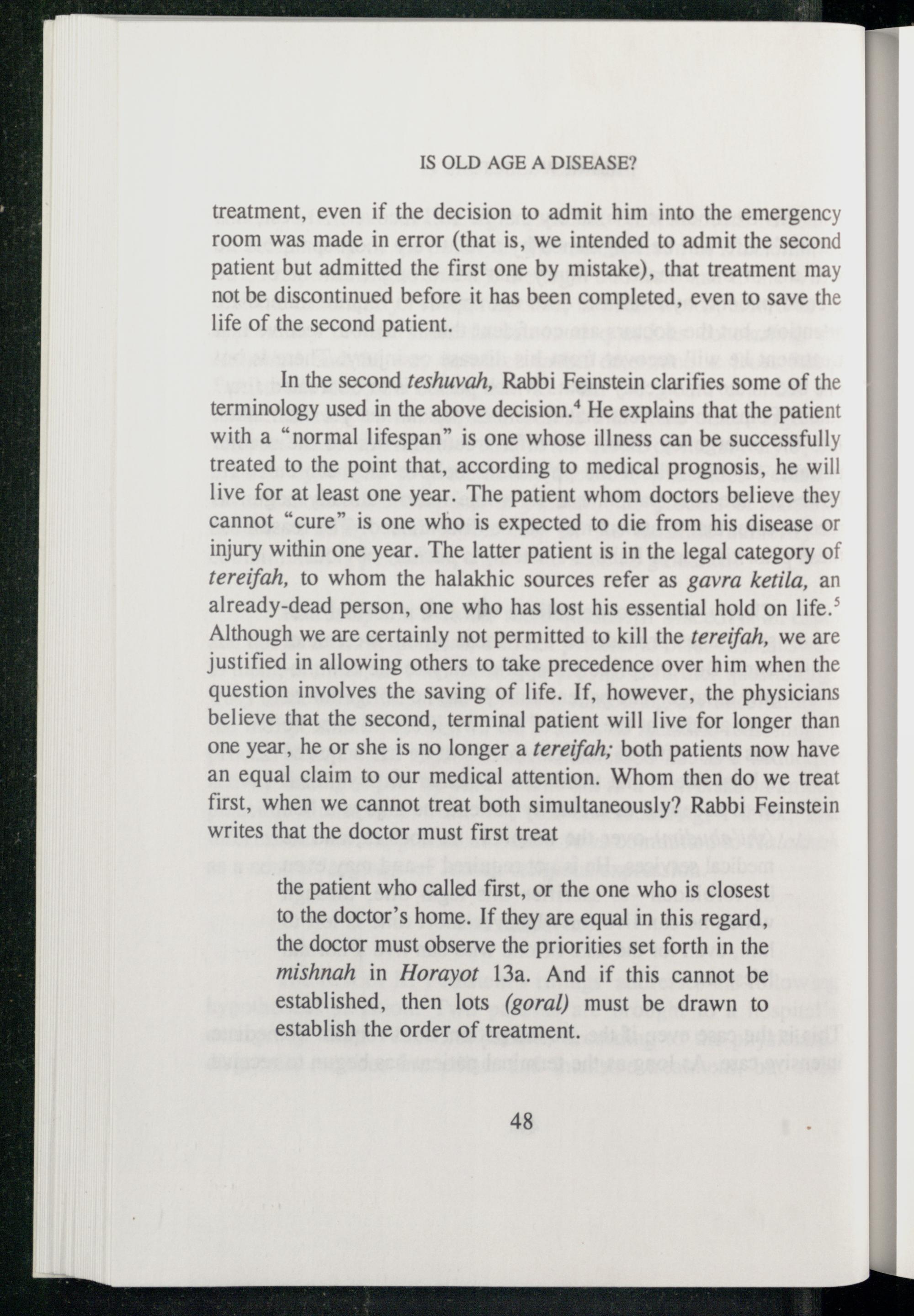 In the second teshuvah, Rabbi Feinstein clarifies some of the terminology used in the above decision.* He explains that the patient with a“normal lifespan” is one whose illness can be successfully treated to the point that, according to medical prognosis, he will live for at least one year. The patient whom doctors believe they cannot“cure” is one who is expected to die from his disease or injury within one year. The latter patient is in the legal category of tereifah, to whom the halakhic sources refer as gavra ketila, an already-dead person, one who has lost his essential hold on life.’ Although we are certainly not permitted to kill the tereifah, we are justified in allowing others to take precedence over him when the question involves the saving of life. If, however, the physicians believe that the second, terminal patient will live for longer than one year, he or she is no longer a tereifah; both patients now have an equal claim to our medical attention. Whom then do we treat first, when we cannot treat both simultaneously? Rabbi Feinstein writes that the doctor must first treat
