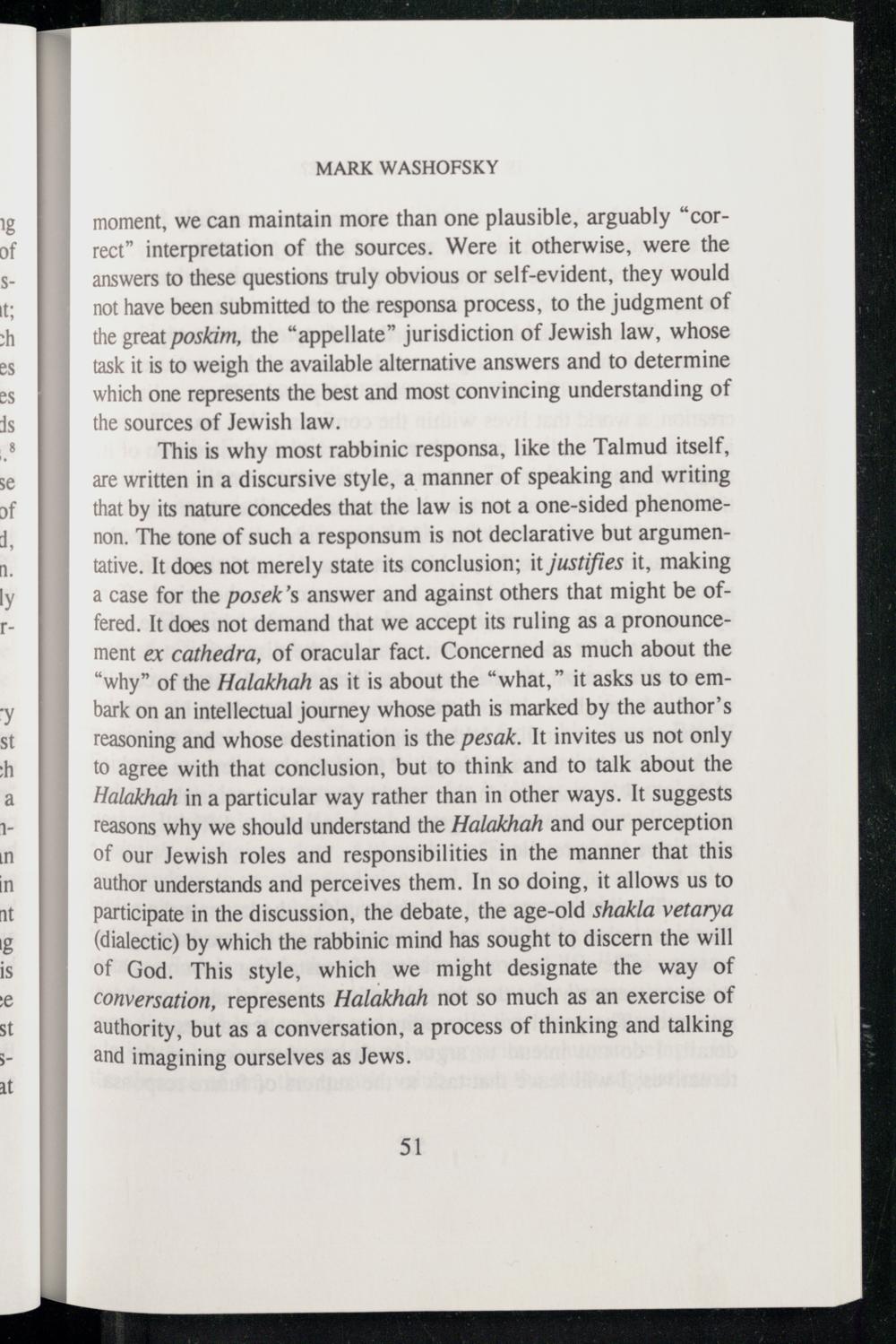 This is why most rabbinic responsa, like the Talmud itself, are written in a discursive style, a manner of speaking and writing that by its nature concedes that the law is not a one-sided phenomenon. The tone of such a responsum is not declarative but argumentative. It does not merely state its conclusion; it justifies it, making a case for the posek’s answer and against others that might be offered. It does not demand that we accept its ruling as a pronouncement ex cathedra, of oracular fact. Concerned as much about the “why” of the Halakhah as it is about the“what,” it asks us to embark on an intellectual journey whose path is marked by the author’s reasoning and whose destination is the pesak. It invites us not only to agree with that conclusion, but to think and to talk about the Halakhah in a particular way rather than in other ways. It suggests reasons why we should understand the Halakhah and our perception of our Jewish roles and responsibilities in the manner that this author understands and perceives them. In so doing, it allows us to participate in the discussion, the debate, the age-old shakla vetarya (dialectic) by which the rabbinic mind has sought to discern the will of God . This style, which we might designate the way of conversation, represents Halakhah not so much as an exercise of authority, but as a conversation, a process of thinking and talking and imagining ourselves as Jews .