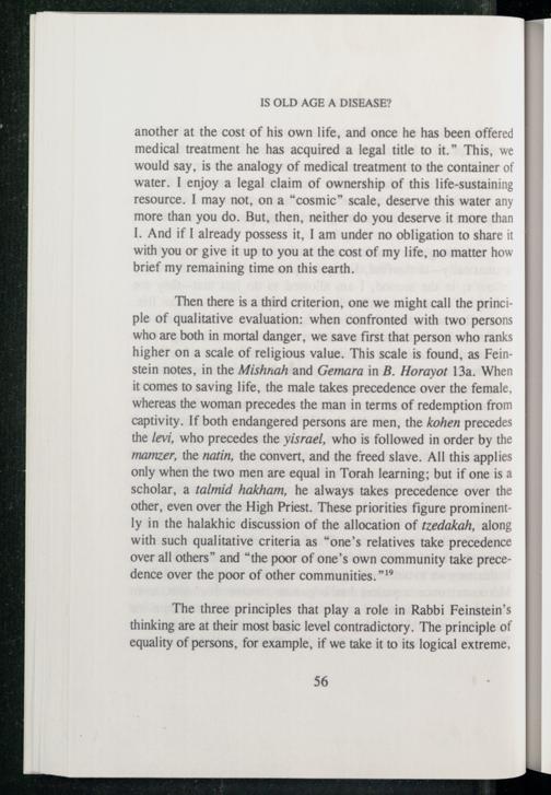 Then there is a third criterion, one we might call the principle of qualitative evaluation: when confronted with two persons who are both in mortal danger, we save first that person who ranks higher on a scale of religious value. This scale is found, as Feinstein notes, in the Mishnah and Gemara in B. Horayot 13a. When it comes to saving life, the male takes precedence over the female, whereas the woman precedes the man in terms of redemption from captivity. If both endangered persons are men, the kohen precedes the levi, who precedes the yisrael, who is followed in order by the mamzer, the natin, the convert, and the freed slave. All this applies only when the two men are equal in Torah learning; but if one is a scholar, a talmid hakham, he always takes precedence over the other, even over the High Priest. These priorities figure prominently in the halakhic discussion of the allocation of tzedakah, along with such qualitative criteria as“one’s relatives take precedence over all others” and“the poor of one’s own community take precedence over the poor of other communities.”*°