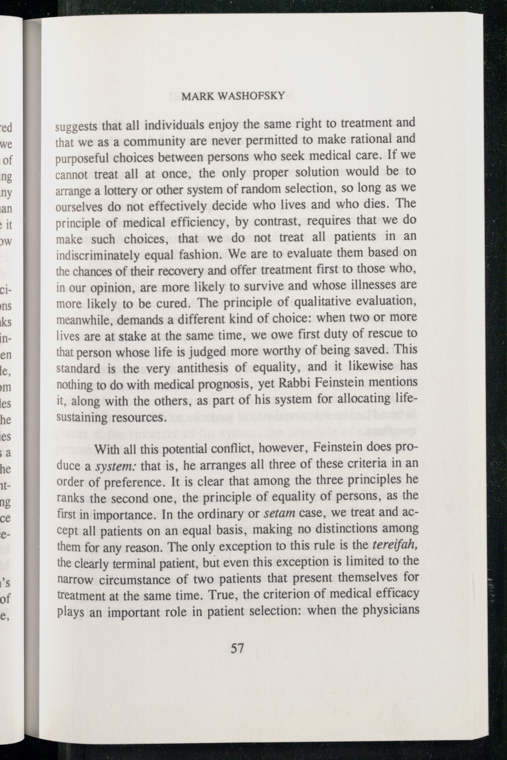 With all this potential conflict, however, Feinstein does produce a system: that is, he arranges all three of these criteria in an order of preference. It is clear that among the three principles he ranks the second one, the principle of equality of persons, as the first in importance. In the ordinary or sefam case, we treat and accept all patients on an equal basis, making no distinctions among them for any reason. The only exception to this rule is the zereifah, the clearly terminal patient, but even this exception is limited to the narrow circumstance of two patients that present themselves for treatment at the same time. True, the criterion of medical efficacy plays an important role in patient selection: when the physicians