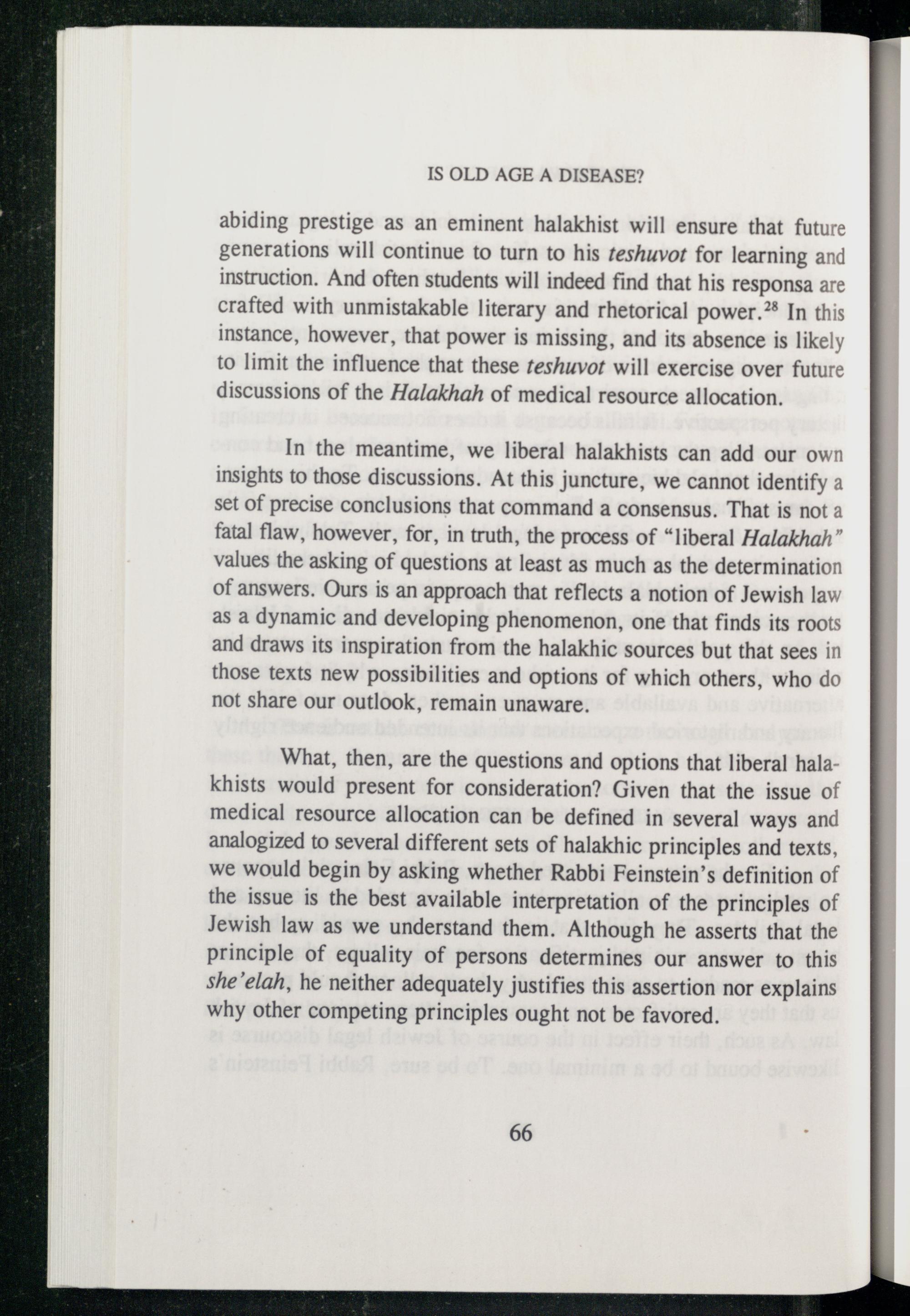 What, then, are the questions and options that liberal halakhists would present for consideration? Given that the issue of medical resource allocation can be defined in several ways and analogized to several different sets of halakhic principles and texts, we would begin by asking whether Rabbi Feinstein’s definition of the issue is the best available interpretation of the principles of Jewish law as we understand them. Although he asserts that the principle of equality of persons determines our answer to this she’elah, he neither adequately justifies this assertion nor explains why other competing principles ought not be favored.