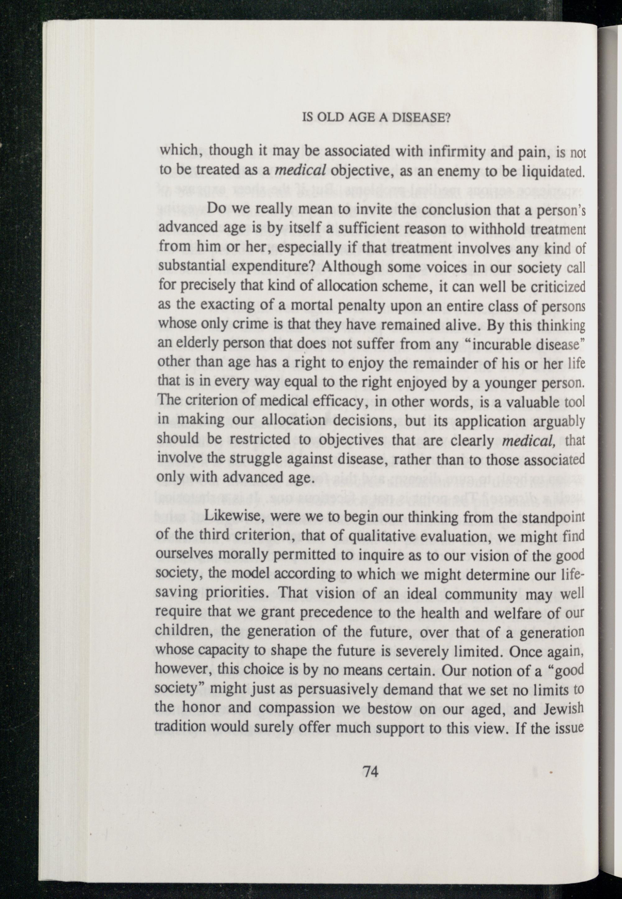 Likewise, were we to begin our thinking from the standpoint of the third criterion, that of qualitative evaluation, we might find ourselves morally permitted to inquire as to our vision of the good society, the model according to which we might determine our lifesaving priorities. That vision of an ideal community may well require that we grant precedence to the health and welfare of our children, the generation of the future, over that of a generation whose capacity to shape the future is severely limited. Once again, however, this choice is by no means certain. Our notion of a“good society” might just as persuasively demand that we set no limits to the honor and compassion we bestow on our aged, and Jewish tradition would surely offer much support to this view. If the issue