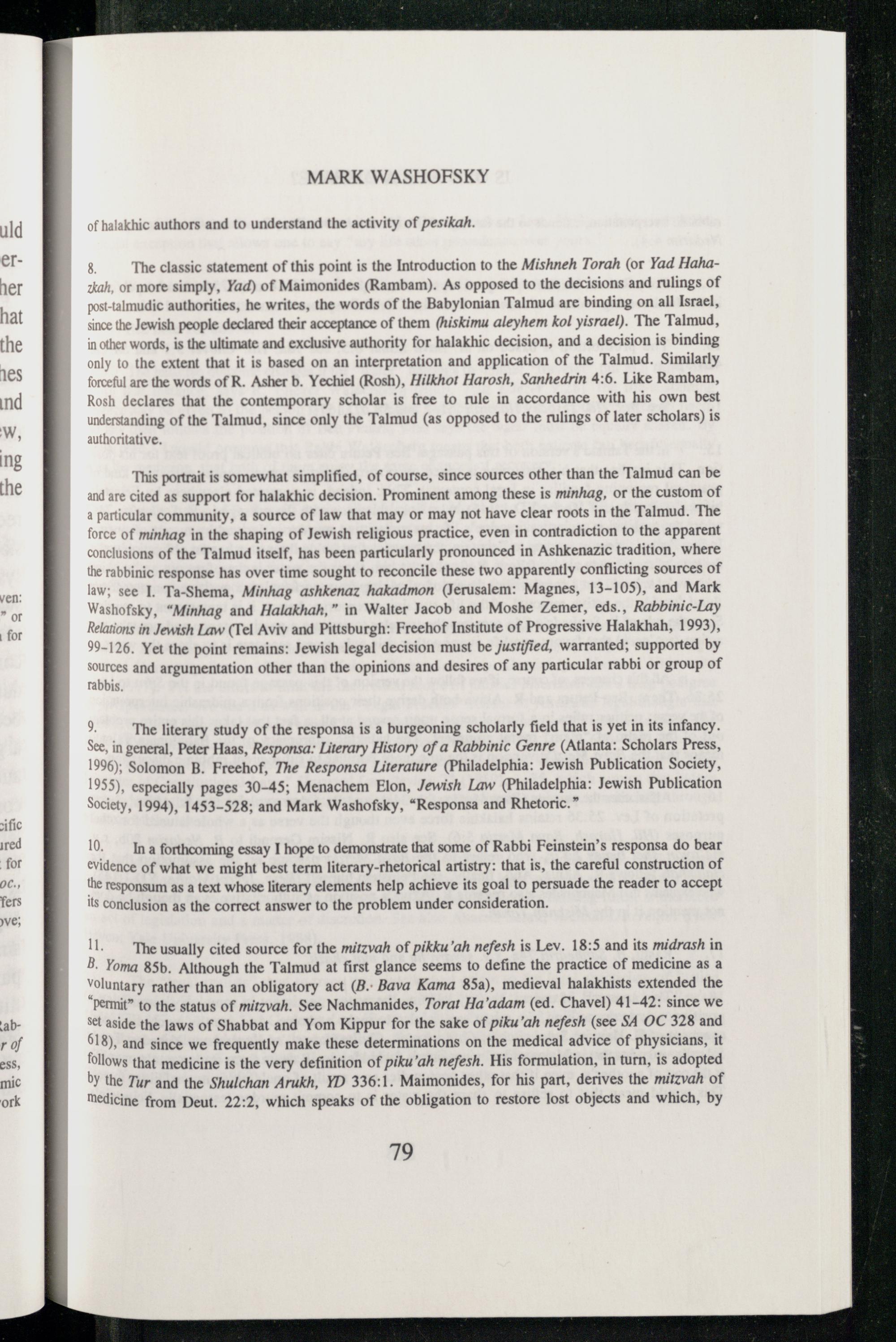 8. The classic statement of this point is the Introduction to the Mishneh Torah(or Yad Hahatkah, or more simply, Yad) of Maimonides (Rambam ). As opposed to the decisions and rulings of post-talmudic authorities, he writes, the words of the Babylonian Talmud are binding on all Israel , since the Jewish people declared their acceptance of them(hiskimu aleyhem kol yisrael). The Talmud , in other words, is the ultimate and exclusive authority for halakhic decision, and a decision is binding only to the extent that it is based on an interpretation and application of the Talmud . Similarly forceful are the words of R. Asher b. Yechiel(Rosh), Hilkhot Harosh, Sanhedrin 4:6. Like Rambam , Rosh declares that the contemporary scholar is free to rule in accordance with his own best understanding of the Talmud , since only the Talmud (as opposed to the rulings of later scholars) is authoritative.