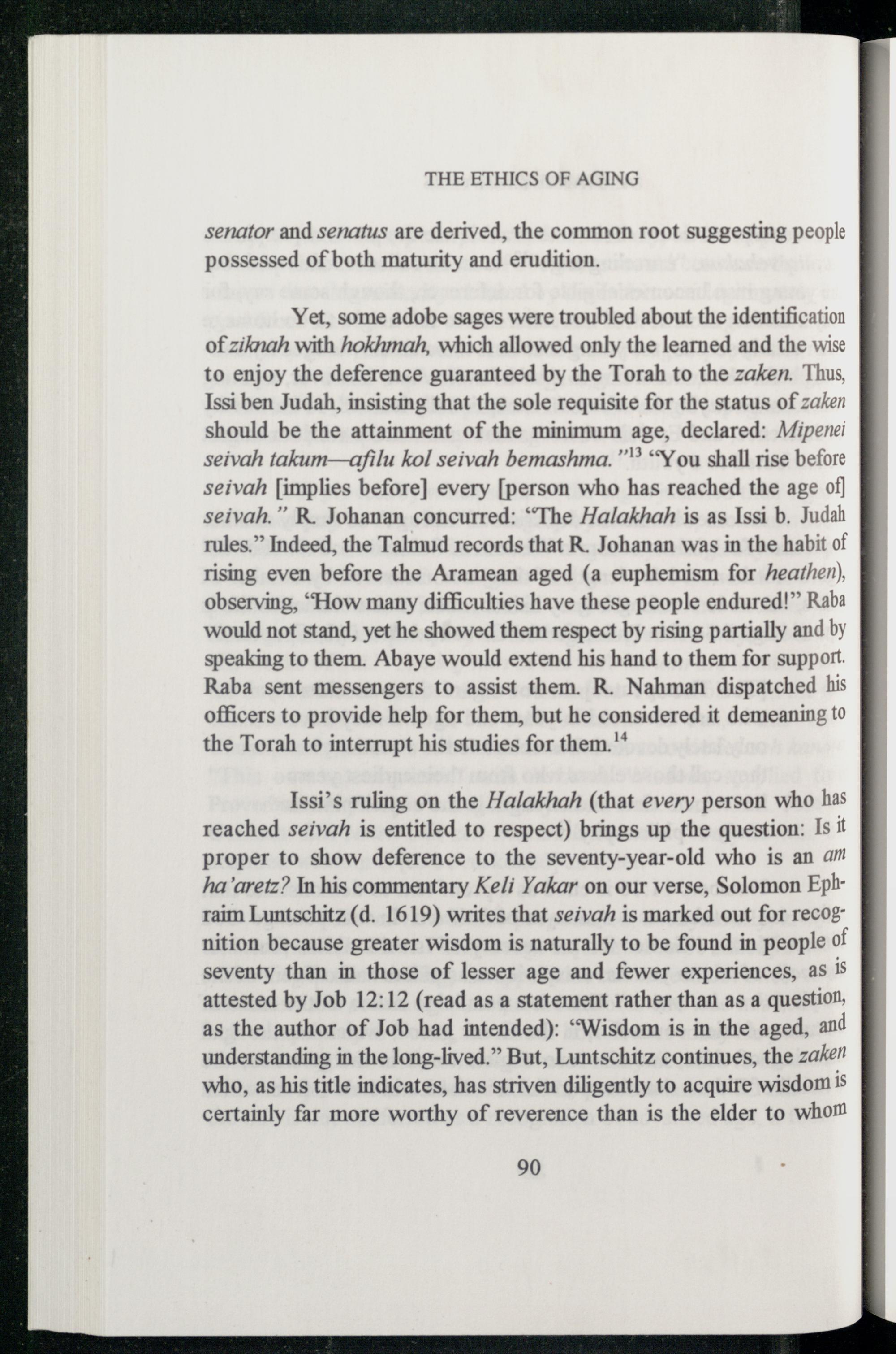 Yet, some adobe sages were troubled about the identification of ziknah with hokhmah, which allowed only the learned and the wise to enjoy the deference guaranteed by the Torah to the zaken. Thus, Issi ben Judah, insisting that the sole requisite for the status of zaken should be the attainment of the minimum age, declared: Mipenei seivah takum—afilu kol seivah bemashma.”"“You shall rise before seivah[implies before] every[person who has reached the age of] seivah.” R. Johanan concurred:“The Halakhah is as Issi b. Judah rules.” Indeed, the Talmud records that R. Johanan was in the habit of rising even before the Aramean aged(a euphemism for heathen), observing,“How many difficulties have these people endured!” Raba would not stand, yet he showed them respect by rising partially and by speaking to them. Abaye would extend his hand to them for support.