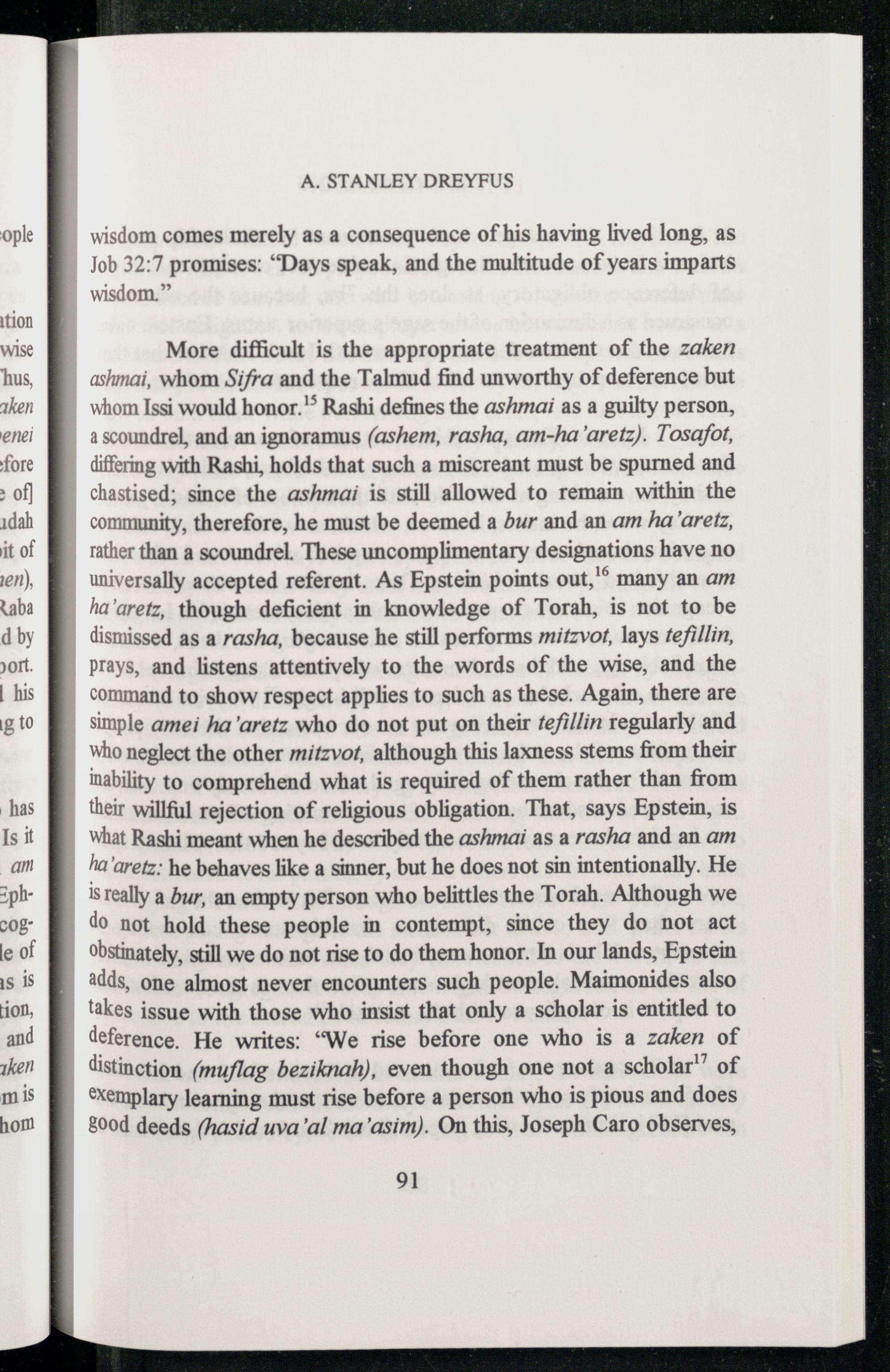 More difficult is the appropriate treatment of the zaken ashmai, whom Sifra and the Talmud find unworthy of deference but whom Issi would honor." Rashi defines the ashmai as a guilty person, a scoundrel, and an ignoramus(ashem, rasha, am-ha‘aretz). Tosafot, differing with Rashi , holds that such a miscreant must be spurned and chastised; since the ashmai is still allowed to remain within the community, therefore, he must be deemed a bur and an am ha'aretz, rather than a scoundrel. These uncomplimentary designations have no universally accepted referent. As Epstein points out,'® many an am ha'aretz, though deficient in knowledge of Torah , is not to be dismissed as a rasha, because he still performs mitzvot, lays tefillin, prays, and listens attentively to the words of the wise, and the command to show respect applies to such as these. Again, there are simple amei ha’aretz who do not put on their zefillin regularly and who neglect the other mitzvot, although this laxness stems from their ability to comprehend what is required of them rather than from their willful rejection of religious obligation. That, says Epstein , is what Rashi meant when he described the ashmai as a rasha and an am ha aretz: he behaves like a sinner, but he does not sin intentionally. He isreally a bur, an empty person who belittles the Torah . Although we do not hold these people in contempt, since they do not act obstinately, still we do not rise to do them honor. In our lands, Epstein adds, one almost never encounters such people. Maimonides also takes issue with those who insist that only a scholar is entitled to deference, He writes:“We rise before one who is a zaken of distinction(muflag beziknah), even though one not a scholar'’ of exemplary learning must rise before a person who is pious and does 800d deeds(hasid uva’al ma’asim). On this, Joseph Caro observes,