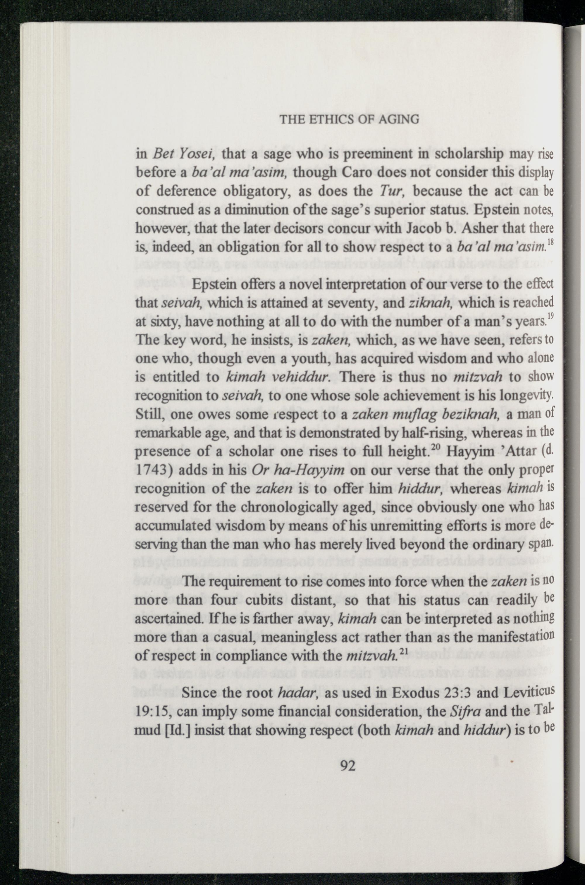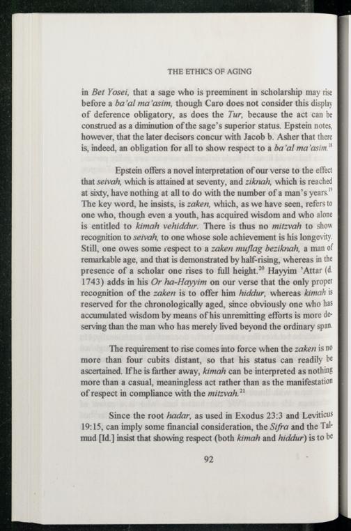 presence of a scholar one rises to full height? Hayyim Attar(d. 1743) adds in his Or ha-Hayyim on our verse that the only proper recognition of the zaken is to offer him hiddur, whereas kimah is reserved for the chronologically aged, since obviously one who has accumulated wisdom by means of his unremitting efforts is more deserving than the man who has merely lived beyond the ordinary span