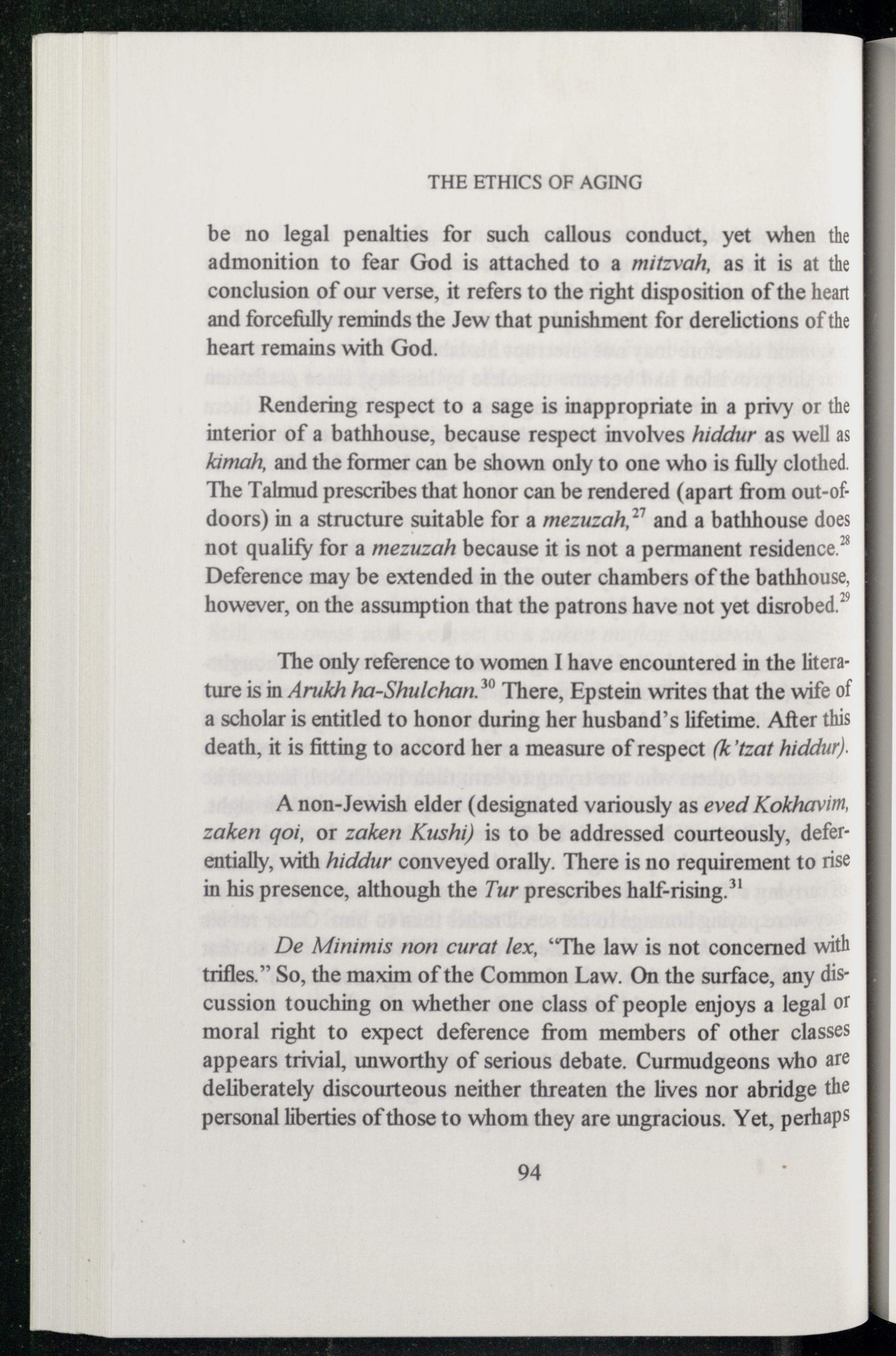 The only reference to women I have encountered in the literature is in Arukh ha-Shulchan.”® There, Epstein writes that the wife of a scholar is entitled to honor during her husband’s lifetime. After this death, it is fitting to accord her a measure of respect(k'tzat hiddur).
