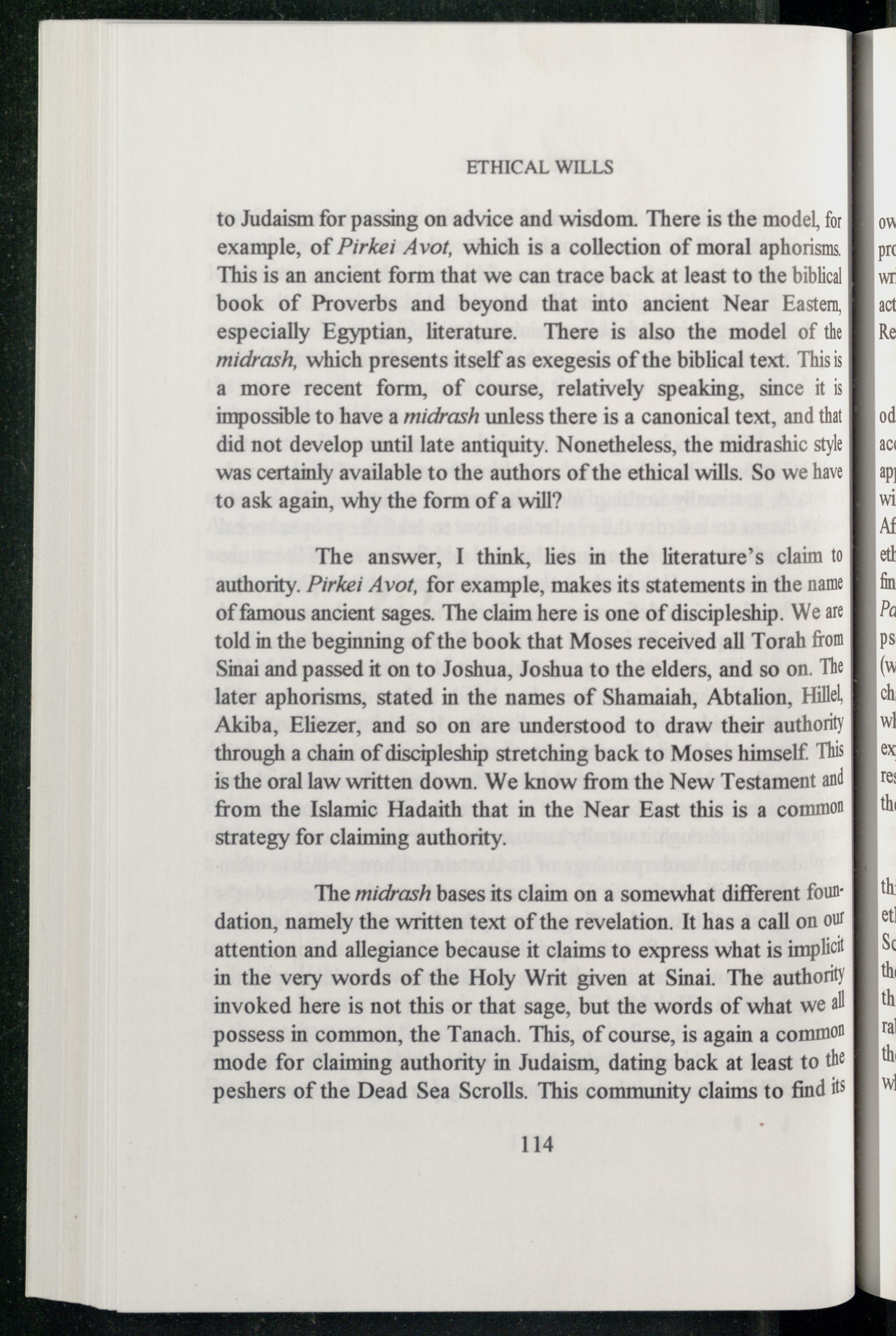 to Judaism for passing on advice and wisdom. There is the model, for example, of Pirkei Avot , which is a collection of moral aphorisms This is an ancient form that we can trace back at least to the biblicil book of Proverbs and beyond that into ancient Near Eastem especially Egyptian, literature. There is also the model of the midrash, which presents itself as exegesis of the biblical text. Thisis a more recent form, of course, relatively speaking, since it is impossible to have a midrash unless there is a canonical text, and that did not develop until late antiquity. Nonetheless, the midrashic styl was certainly available to the authors of the ethical wills. So we have to ask again, why the form of a will?