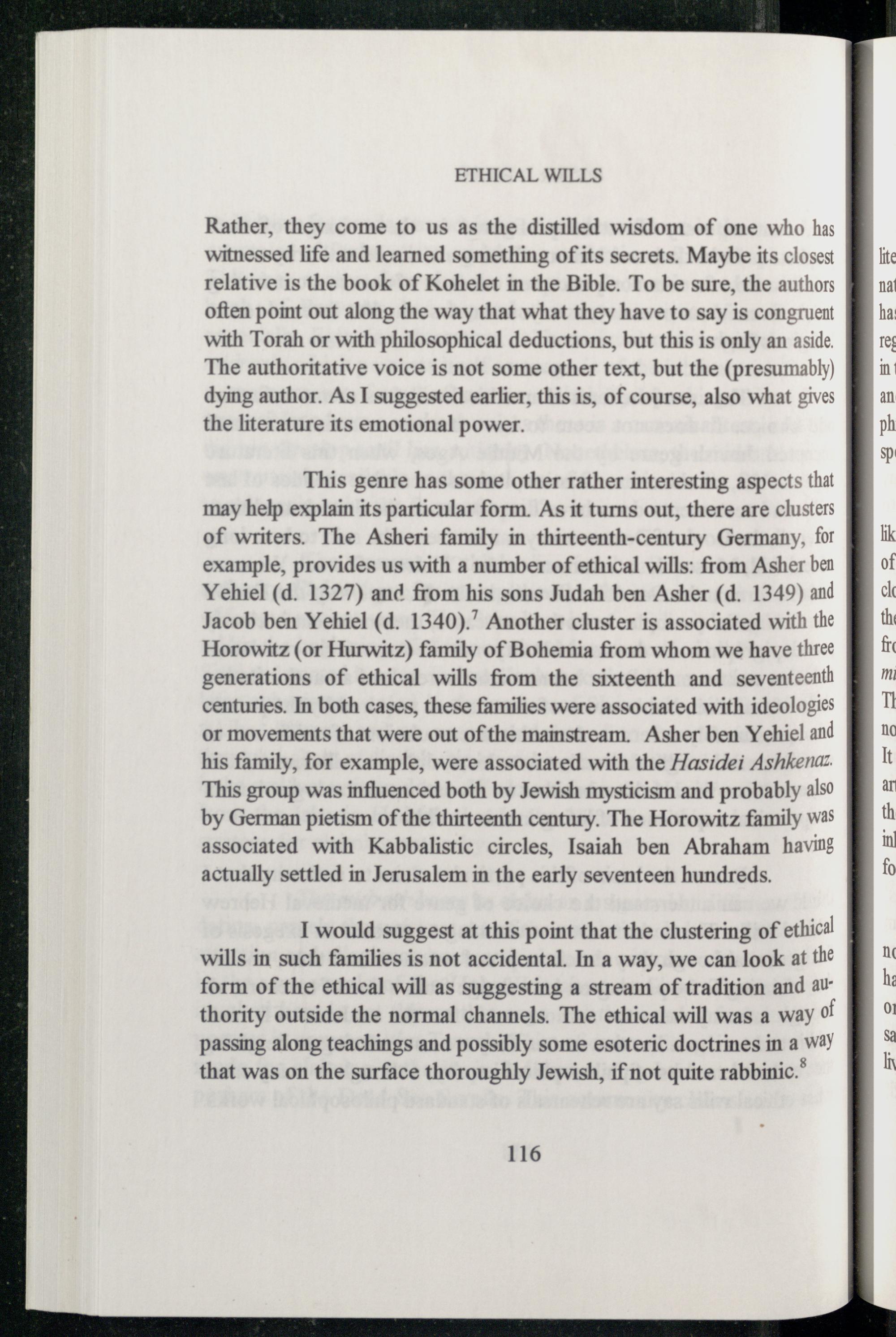 I would suggest at this point that the clustering of ethical wills in such families is not accidental. In a way, we can look at the form of the ethical will as suggesting a stream of tradition and av thority outside the normal channels. The ethical will was a way of passing along teachings and possibly some esoteric doctrines in a way that was on the surface thoroughly Jewish , if not quite rabbinic.”