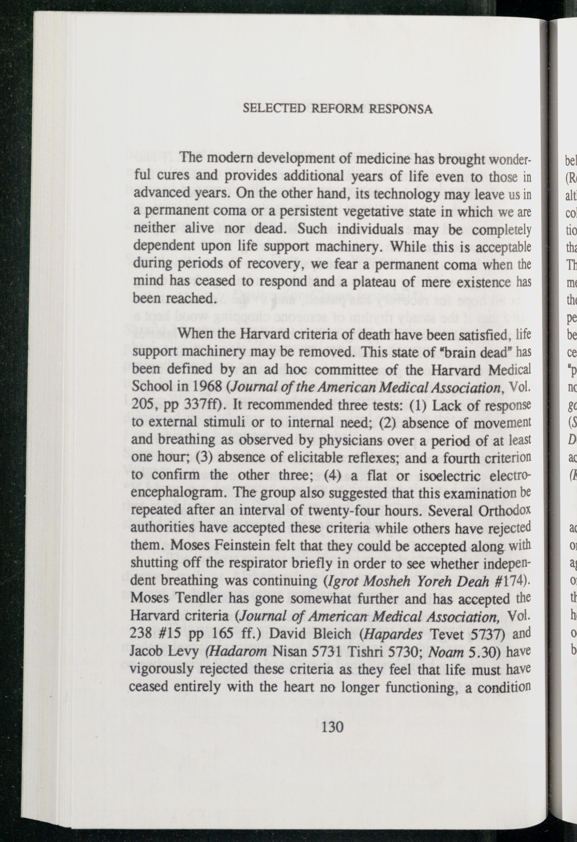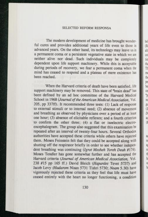 to external stimuli or to internal need;(2) absence of movement and breathing as observed by physicians over a period of at least one hour;(3) absence of elicitable reflexes; and a fourth criterion to confirm the other three;(4) a flat or isoelectric electroencephalogram. The group also suggested that this examination be repeated after an interval of twenty-four hours. Several Orthodox authorities have accepted these criteria while others have rejected them. Moses Feinstein felt that they could be accepted along with shutting off the respirator briefly in order to see whether independent breathing was continuing(Igrot Mosheh Yoreh Deah#174). Moses Tendler has gone somewhat further and has accepted the Harvard criteria(Journal of American Medical Association, Vol. 238#15 pp 165 ff.) David Bleich (Hapardes Tevet 5737) and Jacob Levy(Hadarom Nisan 5731 Tishri 5730; Noam 5.30) have vigorously rejected these criteria as they feel that life must have ceased entirely with the heart no longer functioning, a condition