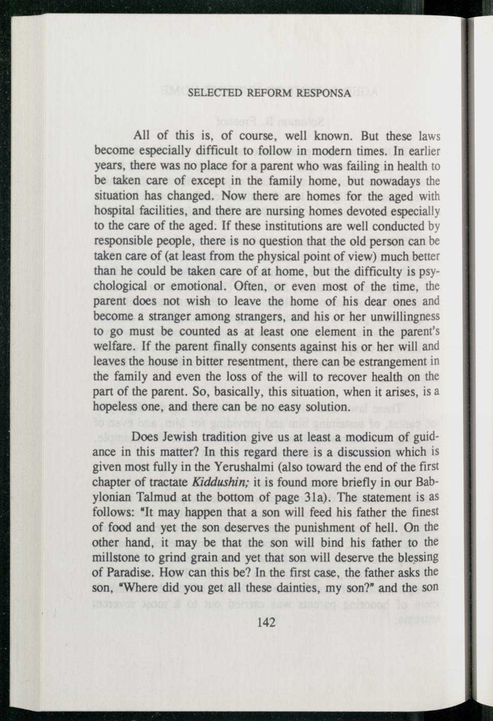 All of this is, of course, well known. But these laws become especially difficult to follow in modern times. In earlier years, there was no place for a parent who was failing in health to be taken care of except in the family home, but nowadays the situation has changed. Now there are homes for the aged with hospital facilities, and there are nursing homes devoted especially to the care of the aged. If these institutions are well conducted by responsible people, there is no question that the old person can be taken care of(at least from the physical point of view) much better than he could be taken care of at home, but the difficulty is psychological or emotional. Often, or even most of the time, the parent does not wish to leave the home of his dear ones and become a stranger among strangers, and his or her unwillingness to go must be counted as at least one element in the parent's welfare. If the parent finally consents against his or her will and leaves the house in bitter resentment, there can be estrangement in the family and even the loss of the will to recover health on the part of the parent. So, basically, this situation, when it arises, is a hopeless one, and there can be no easy solution.