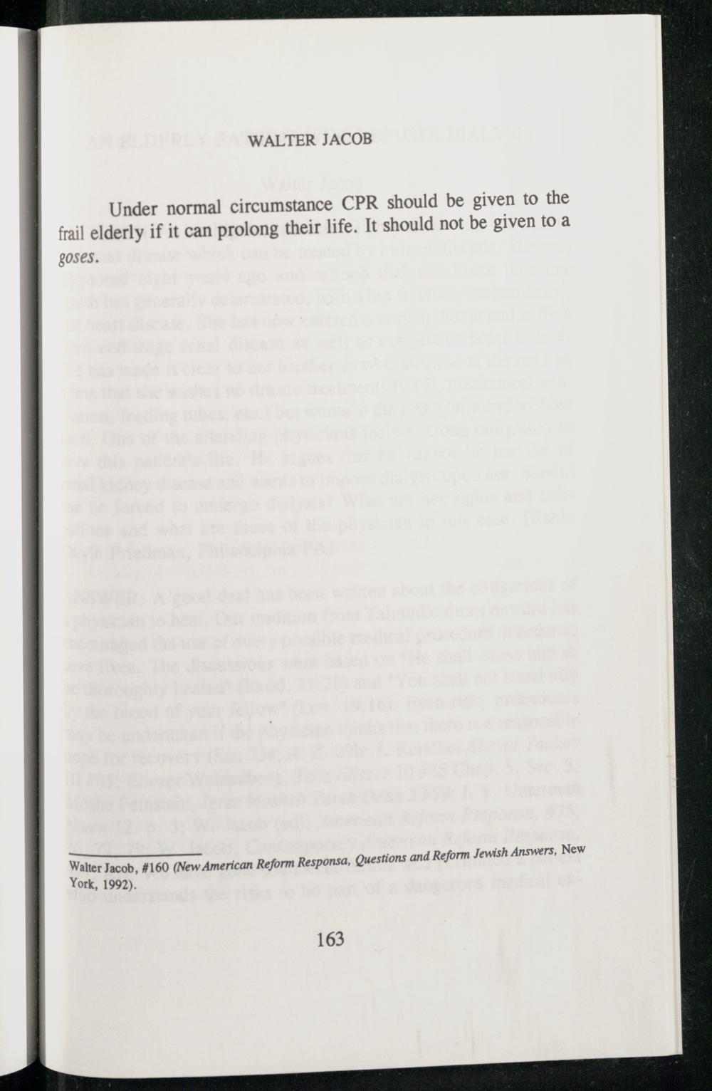 WALTER JACOB Under normal circumstance CPR should be given to the frail elderly if it can prolong their life. It should not be given to a goses. nswers, New rican Reform Responsa, Questions and Reform Jewish A Walter Jacob ,#160(New Ame York, 1992).