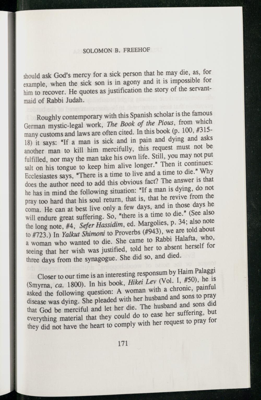 Roughly contemporary with this Spanish scholar is the famous German mystic-legal work, The Book of the Pious, from which many customs and laws are often cited. In this book(p. 100,#31518) it says:“If a man is sick and in pain and dying and asks another man to kill him mercifully, this request must not be fulfilled, nor may the man take his own life. Still, you may not put salt on his tongue to keep him alive longer.” Then it continues: Ecclesiastes says,“There is a time to live and a time to die.” Why does the author need to add this obvious fact? The answer is that he has in mind the following situation:“If a man is dying, do not pray too hard that his soul return, that is, that he revive from the coma. He can at best live only a few days, and in those days he will endure great suffering. So,“there is a time to die.”(See also the long note,#4, Sefer Hassidim, ed. Margolies, p. 34; also note to#723.) In Yalkut Shimoni to Proverbs (#943), we are told about a woman who wanted to die. She came tO Rabbi Halafta, who, seeing that her wish was justified, told her to absent herself for three days from the synagogue. She did so, and died.