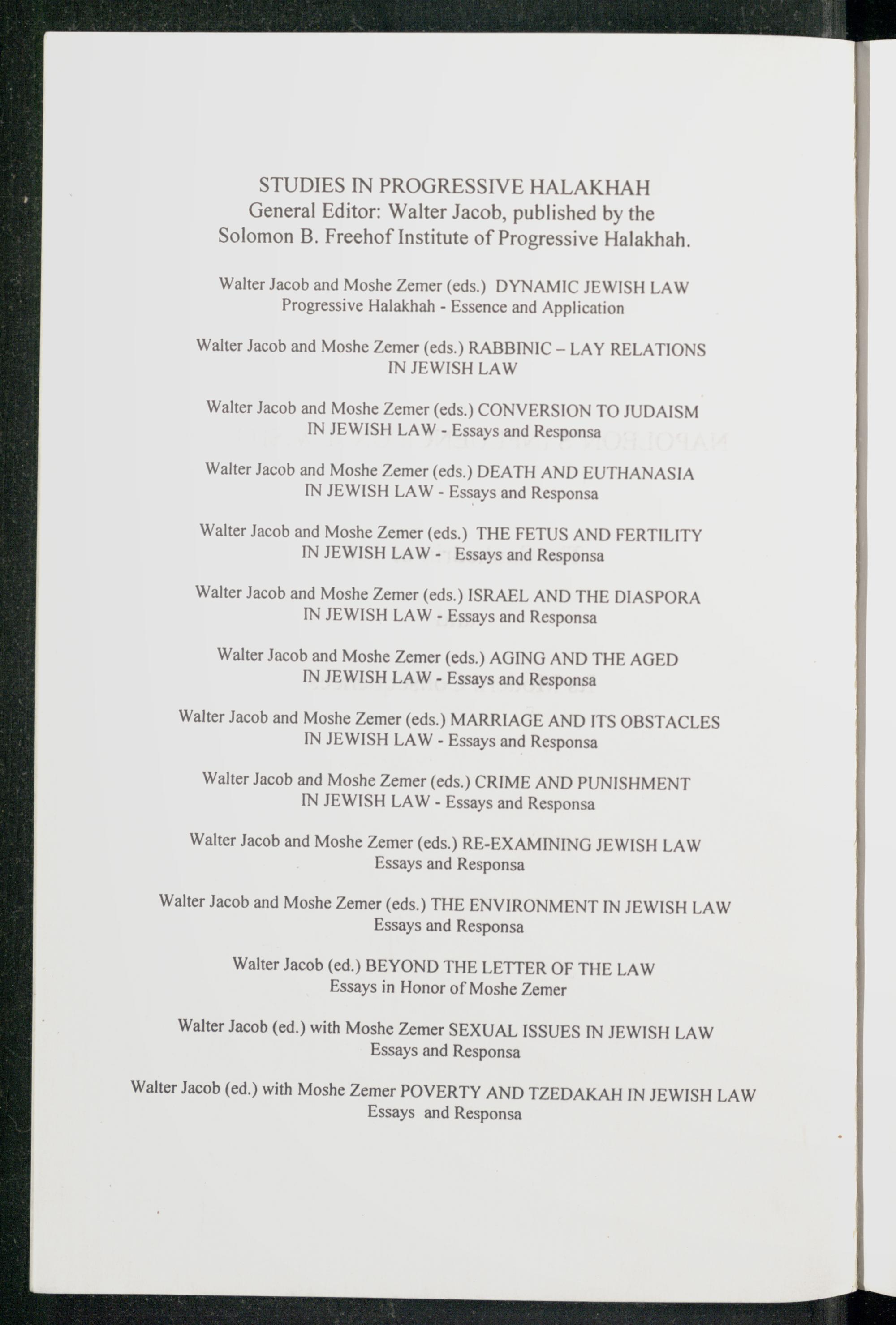 STUDIES IN PROGRESSIVE HALAKHAH General Editor: Walter Jacob , published by the Solomon B. Freehof Institute of Progressive Halakhah.