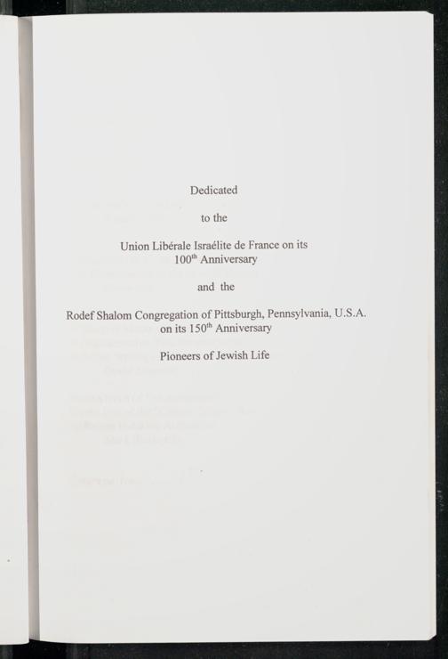 Dedicated to the Union Libérale Israélite de France on its 100" Anniversary and the Rodef Shalom Congregation of Pittsburgh , Pennsylvania , U.S.A. on its 150" Anniversary Pioneers of Jewish Life