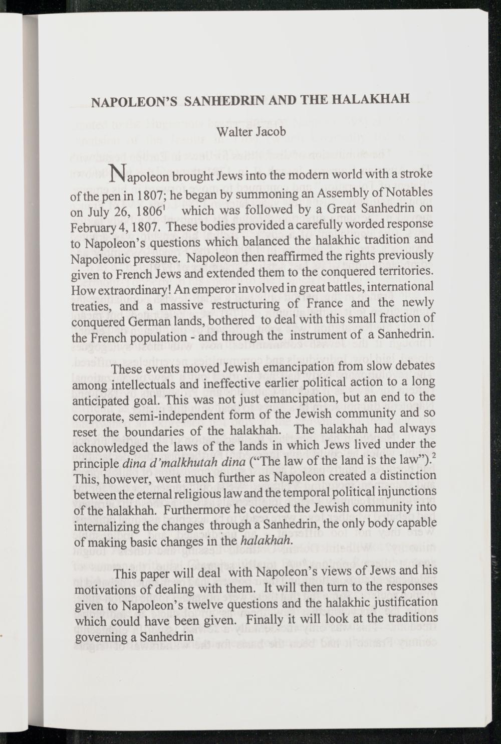 These events moved Jewish emancipation from slow debates among intellectuals and ineffective earlier political action to a long anticipated goal. This was not just emancipation, but an end to the corporate, semi-independent form of the Jewish community and so reset the boundaries of the halakhah. The halakhah had always acknowledged the laws of the lands in which Jews lived under the principle dina d’'malkhutah dina(“The law of the land is the law™).? This, however, went much further as Napoleon created a distinction between the eternal religious law and the temporal political inj unctions of the halakhah. Furthermore he coerced the Jewish community into internalizing the changes through a Sanhedrin, the only body capable of making basic changes in the halakhah.
