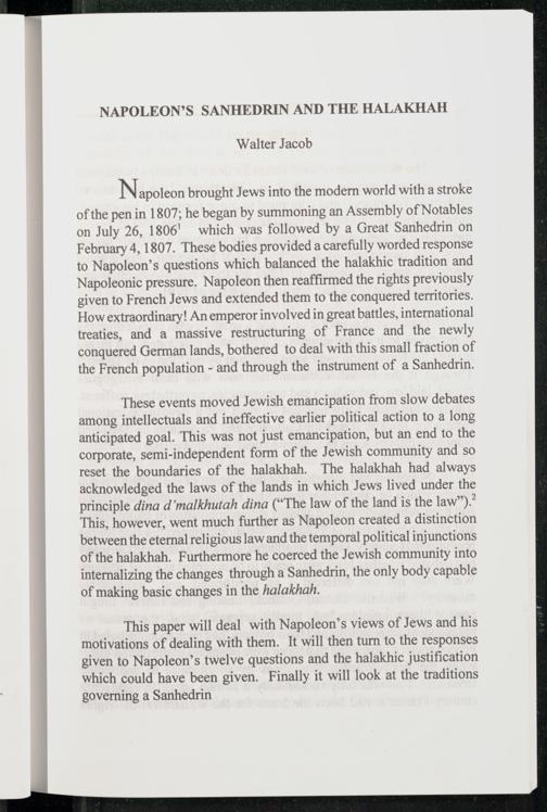 of the pen in 1807; he began by summoning an Assembly of Notables on July 26, 1806' which was followed by a Great Sanhedrin on February 4, 1807. These bodies provided a carefully worded response to Napoleon ’s questions which balanced the halakhic tradition and Napoleonic pressure. Napoleon then reaffirmed the rights previously given to French Jews and extended them to the conquered territories. How extraordinary! An emperor involved in great battles, international treaties, and a massive restructuring of France and the newly conquered German lands, bothered to deal with this small fraction of the French population- and through the instrument of a Sanhedrin.