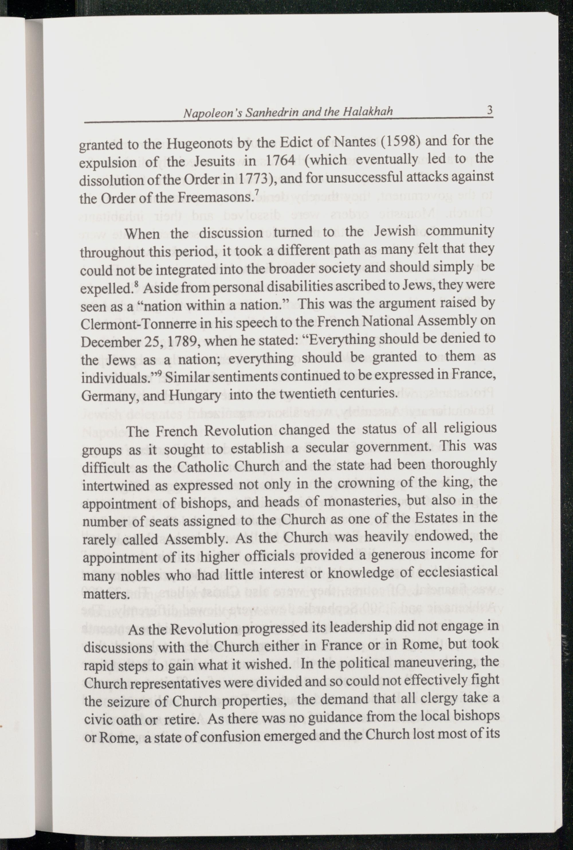When the discussion turned to the Jewish community throughout this period, it took a different path as many felt that they could not be integrated into the broader society and should simply be expelled.® Aside from personal disabilities ascribed to Jews , they were seen as a“nation within a nation.” This was the argument raised by Clermont-Tonnerre in his speech to the French National Assembly on December 25, 1789, when he stated:“Everything should be denied to the Jews as a nation; everything should be granted to them as individuals.” Similar sentiments continued to be expressed in France , Germany , and Hungary into the twentieth centuries.