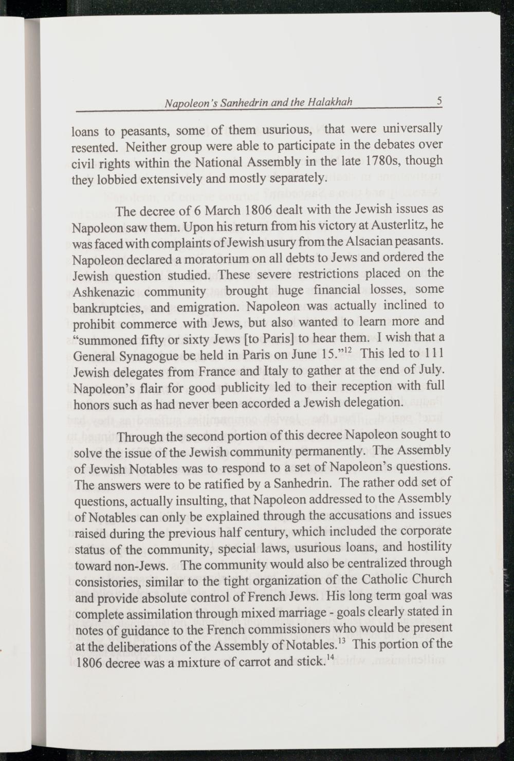 Through the second portion of this decree Napoleon sought to solve the issue of the Jewish community permanently. The Assembly of Jewish Notables was to respond to a set of Napoleon 's questions. The answers were to be ratified by a Sanhedrin. The rather odd set of questions, actually insulting, that Napoleon addressed to the Assembly of Notables can only be explained through the accusations and issues raised during the previous half century, which included the corporate status of the community, special laws, usurious loans, and hostility toward non-Jews . The community would also be centralized through consistories, similar to the tight organization of the Catholic Church and provide absolute control of French Jews . His long term goal was complete assimilation through mixed marriage- goals clearly stated in notes of guidance to the French commissioners who would be present at the deliberations of the Assembly of Notables .” This portion of the 1806 decree was a mixture of carrot and stick."