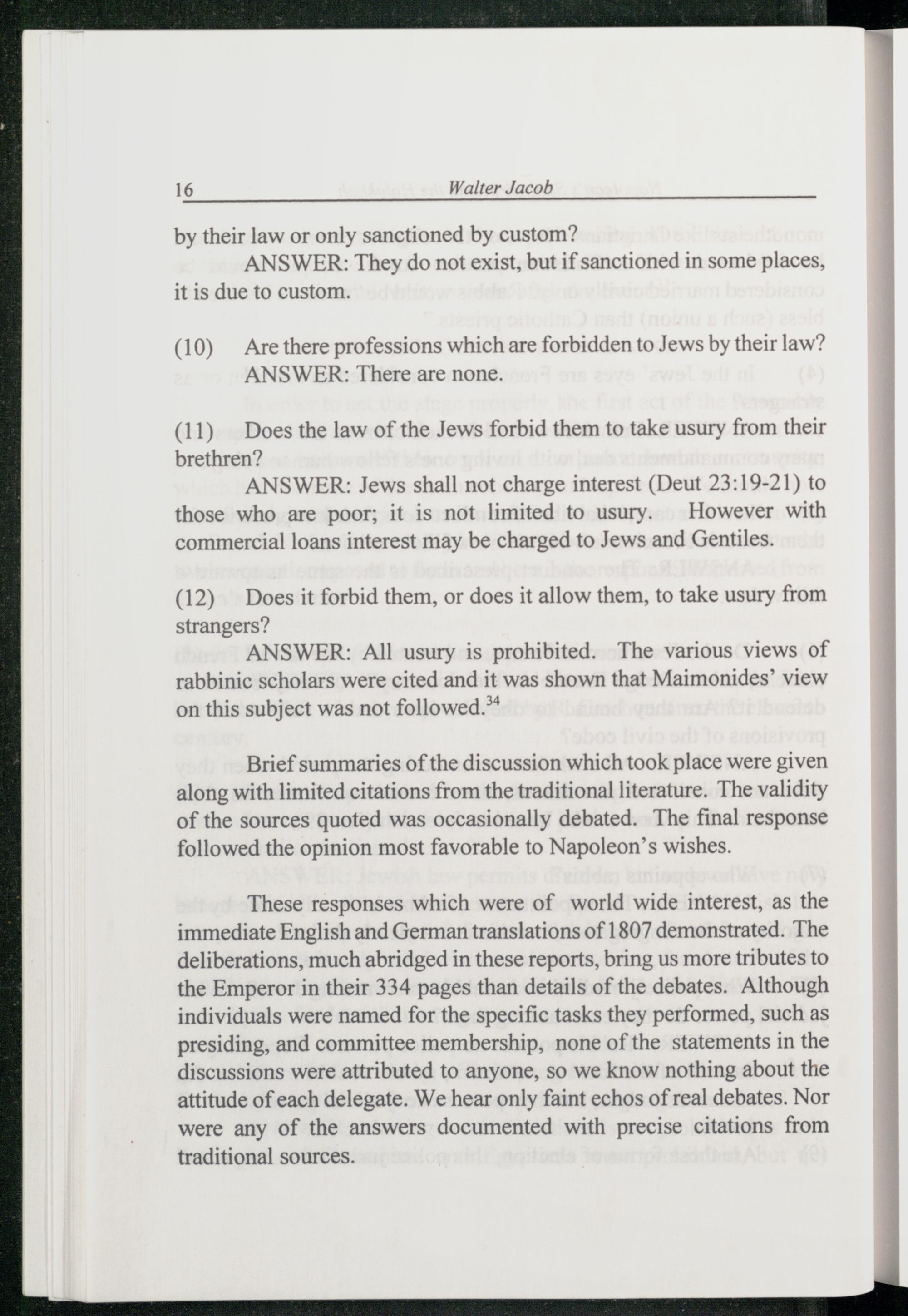 Brief summaries of the discussion which took place were given along with limited citations from the traditional literature. The validity of the sources quoted was occasionally debated. The final response followed the opinion most favorable to Napoleon’s wishes.