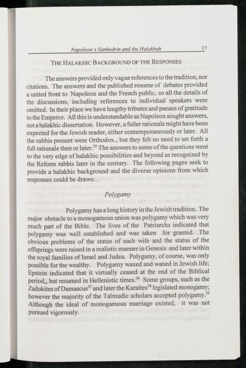 The answers provided only vague references to the tradition, nor citations. The answers and the published resume of debates provided a united front to Napoleon and the French public, so all the details of the discussions, including references to individual speakers were omitted. In their place we have lengthy tributes and paeans of gratitude to the Emperor. All this is understandable as Napoleon sought answers, not a halakhic dissertation. However, a fuller rationale might have been expected for the Jewish reader, either contemporaneously or later. All the rabbis present were Orthodox., but they felt no need to set forth a full rationale then or later.*® The answers to some of the questions went to the very edge of halakhic possibilities and beyond as recognized by the Reform rabbis later in the century. The following pages seek to provide a halakhic background and the diverse opinions from which responses could be drawn..