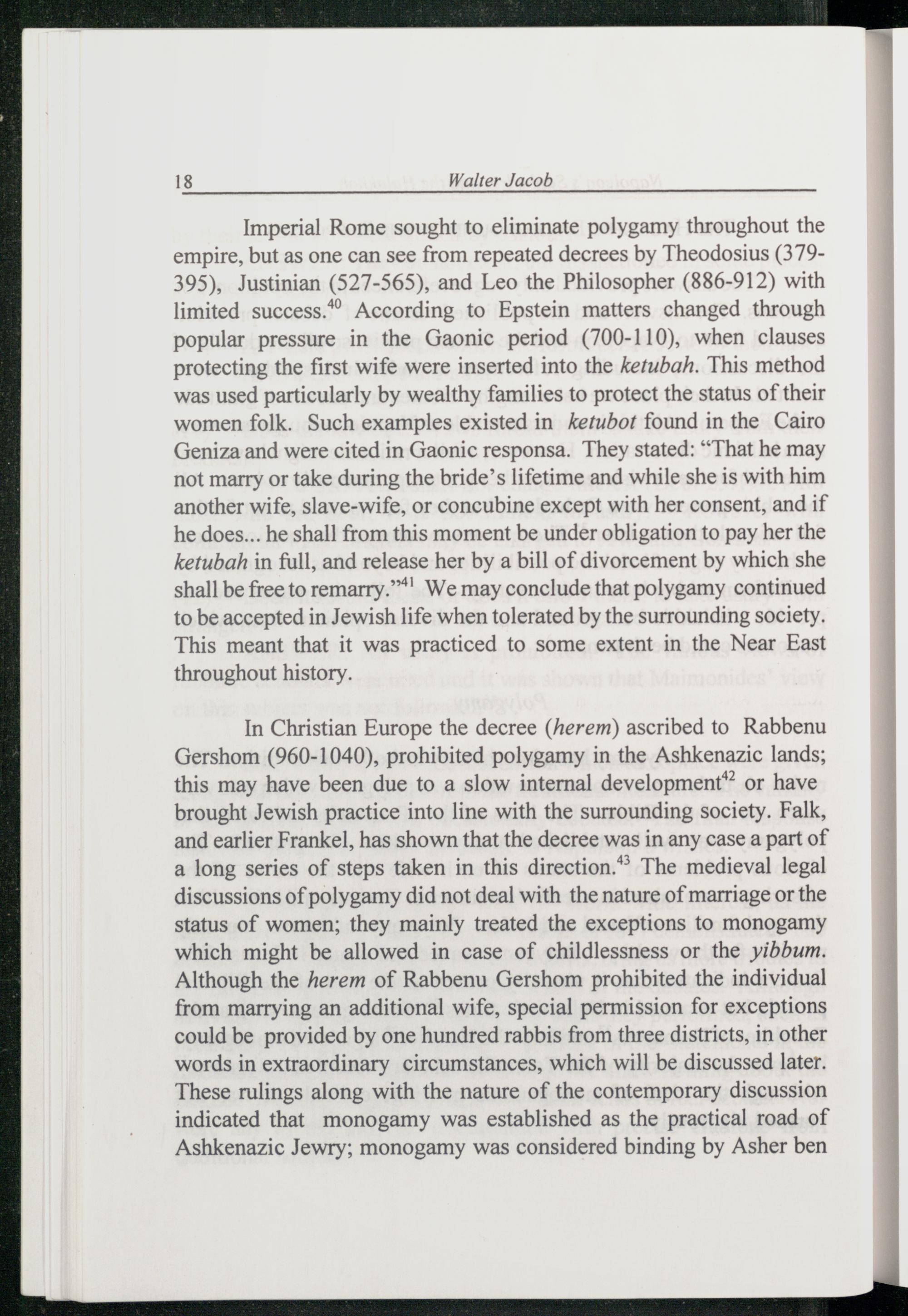 Imperial Rome sought to eliminate polygamy throughout the empire, but as one can see from repeated decrees by Theodosius (379395), Justinian (527-565), and Leo the Philosopher(886-912) with limited success.” According to Epstein matters changed through popular pressure in the Gaonic period(700-110), when clauses protecting the first wife were inserted into the ketubah. This method was used particularly by wealthy families to protect the status of their women folk. Such examples existed in ketubot found in the Cairo Geniza and were cited in Gaonic responsa. They stated:“That he may not marry or take during the bride’s lifetime and while she is with him another wife, slave-wife, or concubine except with her consent, and if he does... he shall from this moment be under obligation to pay her the ketubah in full, and release her by a bill of divorcement by which she shall be free to remarry.”' We may conclude that polygamy continued to be accepted in Jewish life when tolerated by the surrounding society. This meant that it was practiced to some extent in the Near East throughout history.