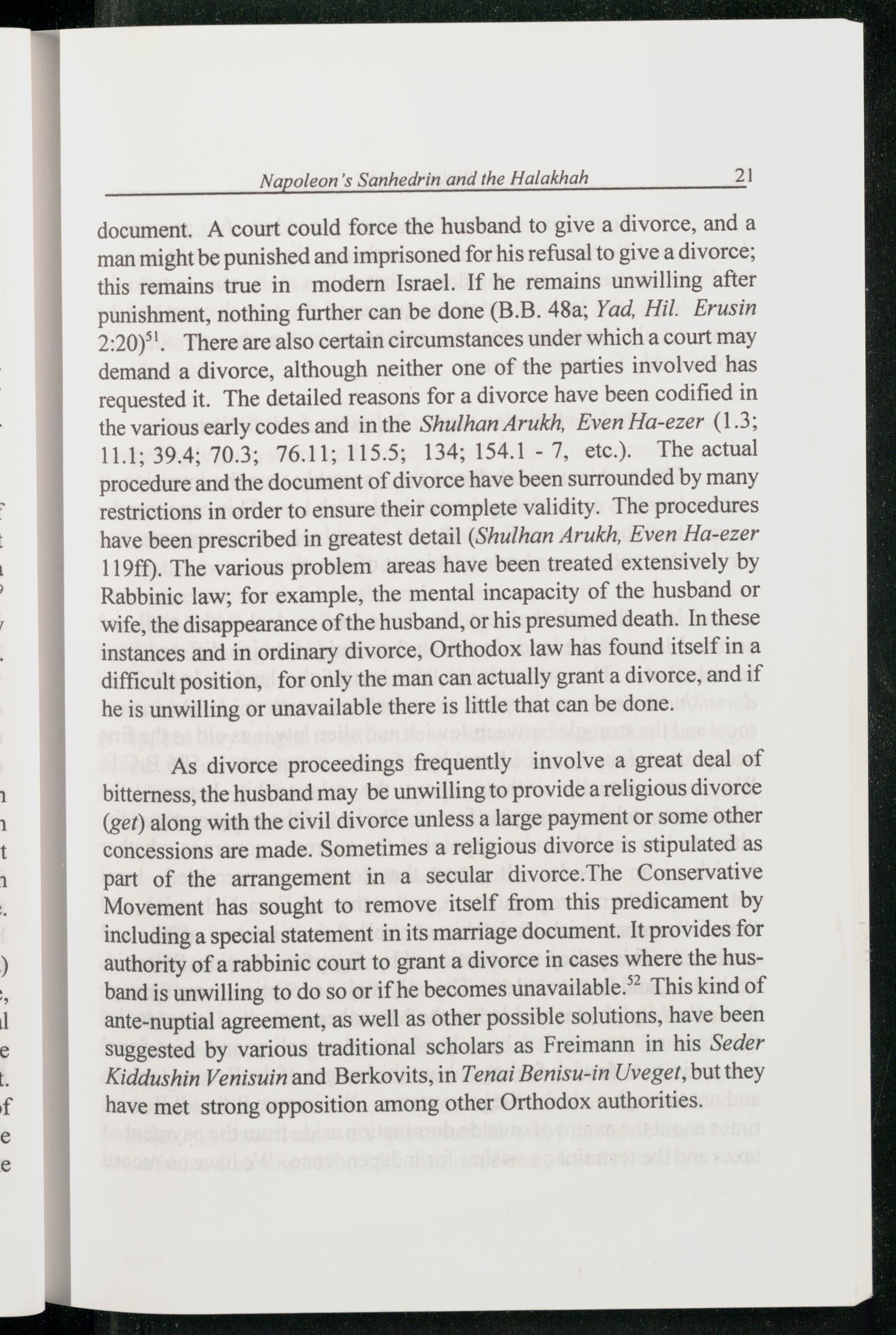 document. A court could force the husband to give a divorce, and a man might be punished and imprisoned for his refusal to give a divorce; this remains true in modern Israel . If he remains unwilling after punishment, nothing further can be done(B.B. 48a; Yad, Hil. Erusin 2:20)°'. There are also certain circumstances under which a court may demand a divorce, although neither one of the parties involved has requested it. The detailed reasons for a divorce have been codified in the various early codes and in the Shulhan Arukh, Even Ha-ezer(1 ¥. 11.1; 39.4; 70.3; 76.11; 115.5; 134; 154.1- 7, etc.). The actual procedure and the document of divorce have been surrounded by many restrictions in order to ensure their complete validity. The procedures have been prescribed in greatest detail(Shulhan Arukh, Even Ha-ezer 119ff). The various problem areas have been treated extensively by Rabbinic law; for example, the mental incapacity of the husband or wife, the disappearance of the husband, or his presumed death. In these instances and in ordinary divorce, Orthodox law has found itself in a difficult position, for only the man can actually grant a divorce, and if he is unwilling or unavailable there is little that can be done.
