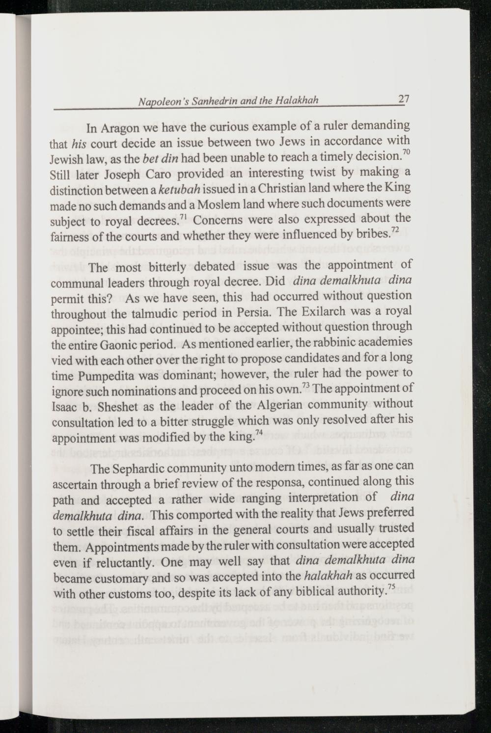 The Sephardic community unto modern times, as far as one can ascertain through a brief review of the responsa, continued along this path and accepted a rather wide ranging interpretation of dina demalkhuta dina. This comported with the reality that Jews preferred to settle their fiscal affairs in the general courts and usually trusted them. Appointments made by the ruler with consultation were accepted even if reluctantly. One may well say that dina demalkhuta dina became customary and so was accepted into the halakhah as occurred with other customs too, despite its lack of any biblical authority.”