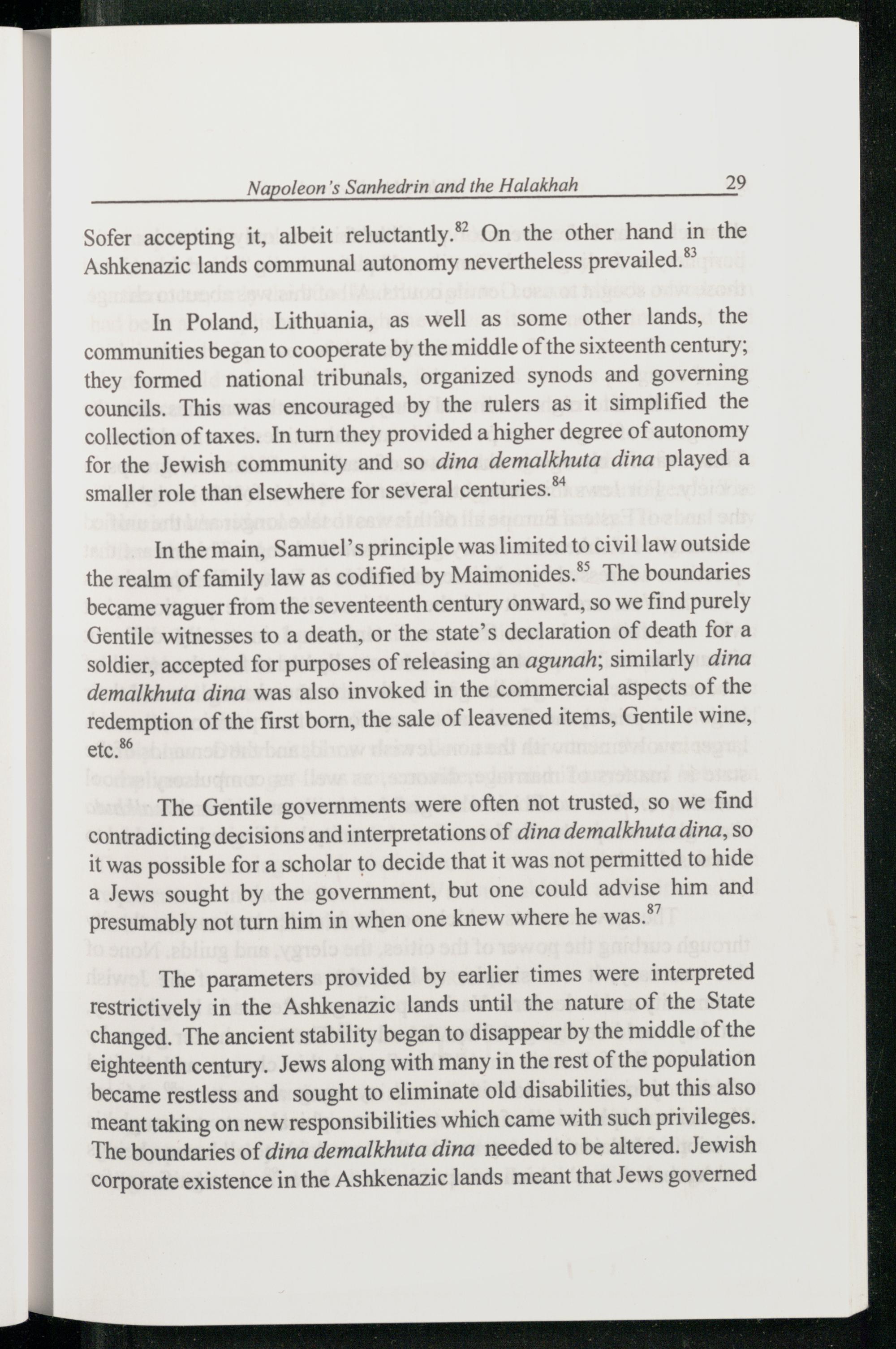 In the main, Samuel’s principle was limited to civil law outside the realm of family law as codified by Maimonides .” The boundaries became vaguer from the seventeenth century onward, so we find purely Gentile witnesses to a death, or the state’s declaration of death for a soldier, accepted for purposes of releasing an agunah; similarly dina demalkhuta dina was also invoked in the commercial aspects of the redemption of the first born, the sale of leavened items, Gentile wine, etc