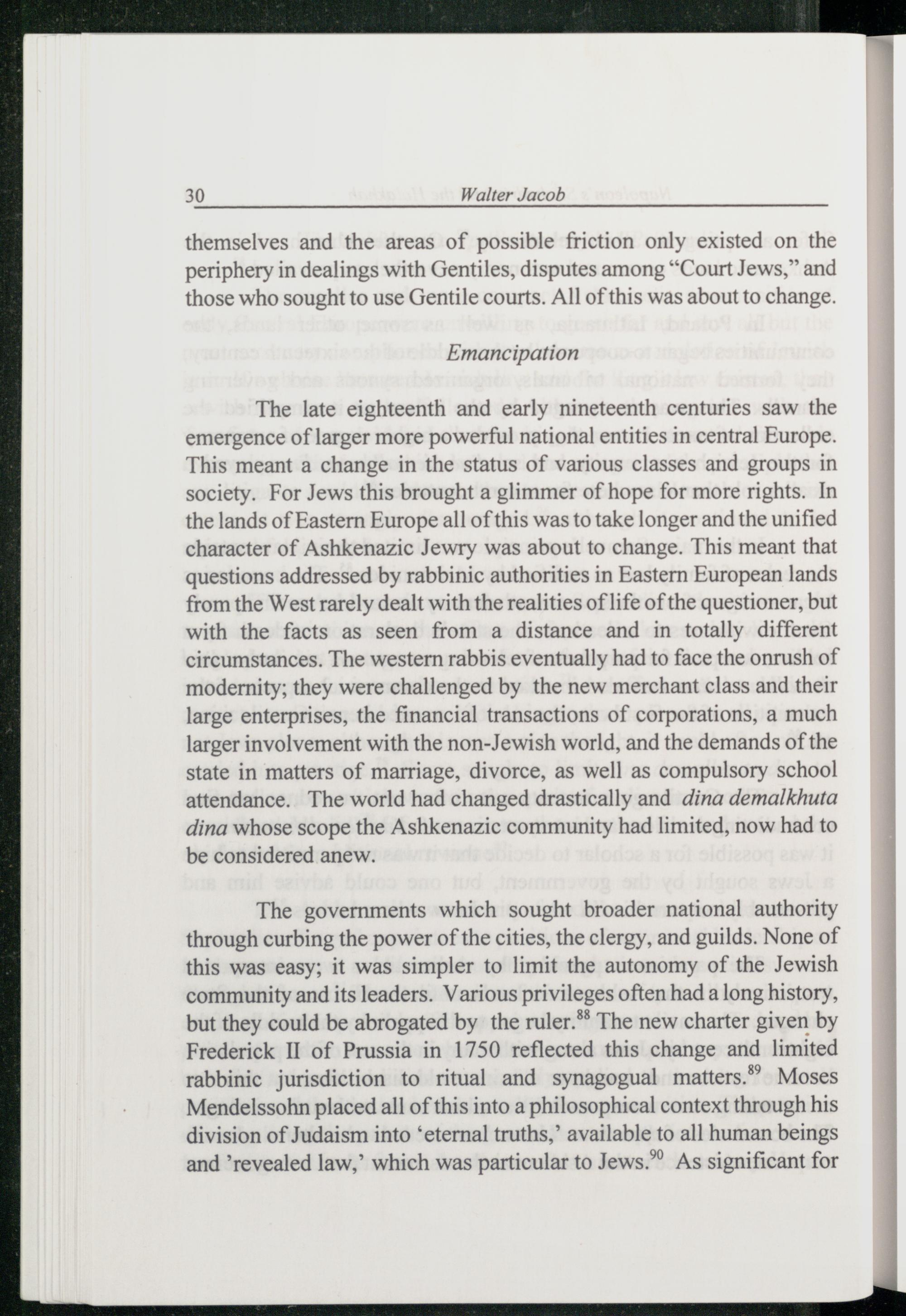 The governments which sought broader national authority through curbing the power of the cities, the clergy, and guilds. None of this was easy; it was simpler to limit the autonomy of the Jewish community and its leaders. Various privileges often had a long history, but they could be abrogated by the ruler.*® The new charter given by Frederick II of Prussia in 1750 reflected this change and limited rabbinic jurisdiction to ritual and synagogual matters. Moses Mendelssohn placed all of this into a philosophical context through his division of Judaism into‘eternal truths,’ available to all human beings and‘revealed law,” which was particular to Jews .” As significant for