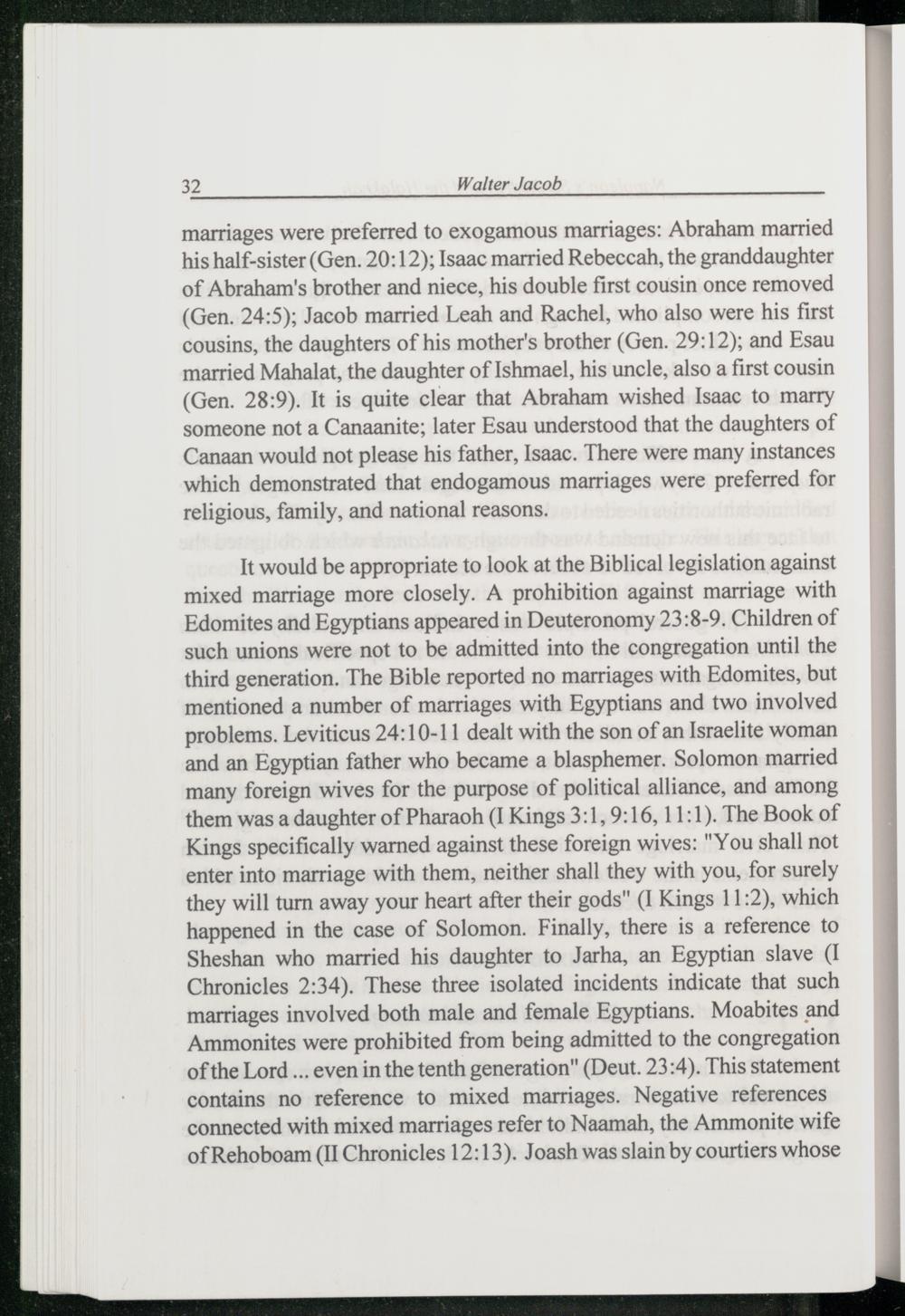 It would be appropriate to look at the Biblical legislation against mixed marriage more closely. A prohibition against marriage with Edomites and Egyptians appeared in Deuteronomy 23:8-9. Children of such unions were not to be admitted into the congregation until the third generation. The Bible reported no marriages with Edomites , but mentioned a number of marriages with Egyptians and two involved problems. Leviticus 24:10-11 dealt with the son of an Israelite woman and an Egyptian father who became a blasphemer. Solomon married many foreign wives for the purpose of political alliance, and among them was a daughter of Pharaoh (I Kings 3:1, 9:16, 11:1). The Book of Kings specifically warned against these foreign wives:"You shall not enter into marriage with them, neither shall they with you, for surely they will turn away your heart after their gods"(I Kings 11:2), which happened in the case of Solomon . Finally, there is a reference to Sheshan who married his daughter to Jarha, an Egyptian slave(I Chronicles 2:34). These three isolated incidents indicate that such marriages involved both male and female Egyptians. Moabites and Ammonites were prohibited from being admitted to the congregation of the Lord... even in the tenth generation"(Deut. 23:4). This statement contains no reference to mixed marriages. Negative references connected with mixed marriages refer to Naamah, the Ammonite wife of Rehoboam (II Chronicles 12:13). Joash was slain by courtiers whose