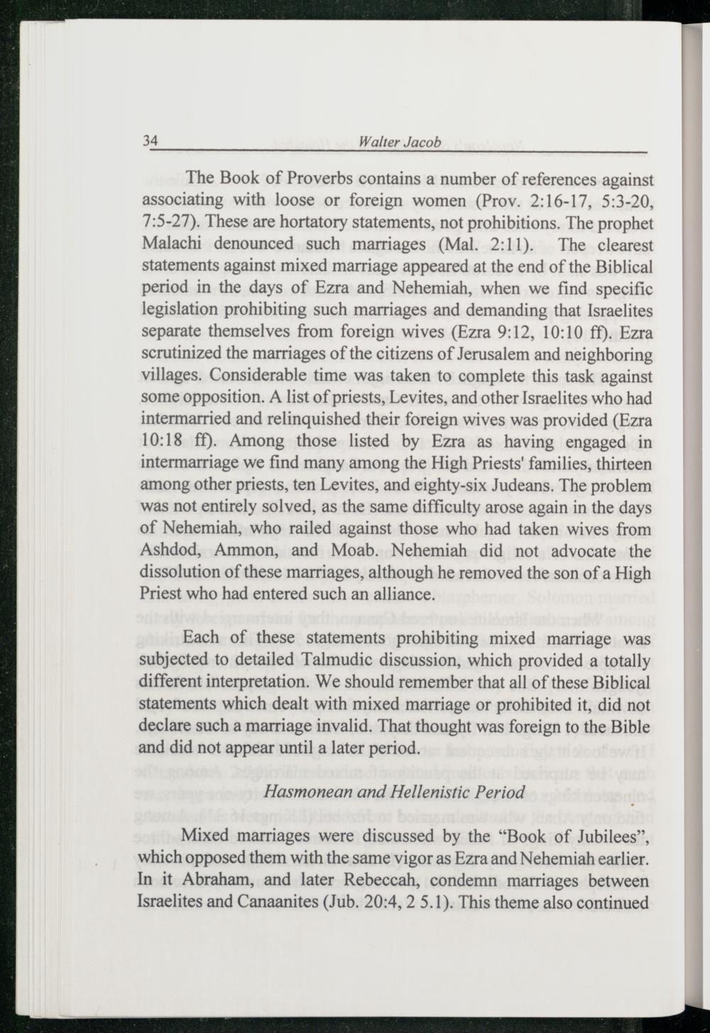 The Book of Proverbs contains a number of references against associating with loose or foreign women(Prov. 2:16-17, 5:3-20, 7:5-27). These are hortatory statements, not prohibitions. The prophet Malachi denounced such marriages(Mal. 2:11). The clearest statements against mixed marriage appeared at the end of the Biblical period in the days of Ezra and Nehemiah , when we find specific legislation prohibiting such marriages and demanding that Israelites separate themselves from foreign wives(Ezra 9:12, 10:10 ff). Ezra scrutinized the marriages of the citizens of Jerusalem and neighboring villages. Considerable time was taken to complete this task against some opposition. A list of priests, Levites, and other Israelites who had intermarried and relinquished their foreign wives was provided(Ezra 10:18 ff). Among those listed by Ezra as having engaged in intermarriage we find many among the High Priests’ families, thirteen among other priests, ten Levites, and eighty-six Judeans . The problem was not entirely solved, as the same difficulty arose again in the days of Nehemiah , who railed against those who had taken wives from Ashdod , Ammon, and Moab. Nehemiah did not advocate the dissolution of these marriages, although he removed the son of a High Priest who had entered such an alliance.