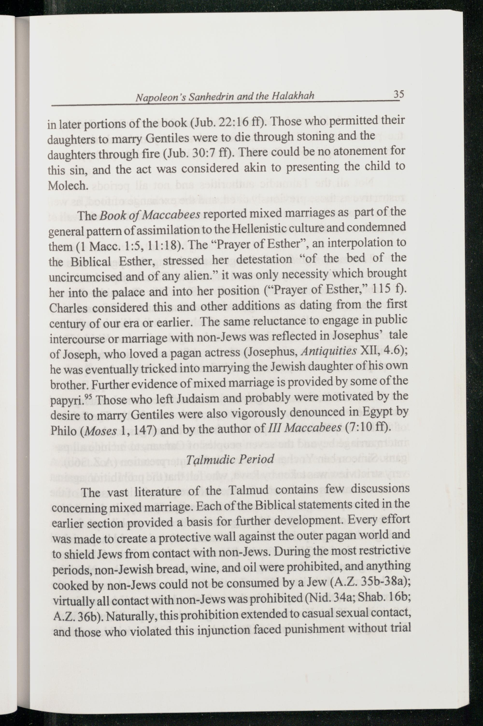 The Book of Maccabees reported mixed marriages as part of the general pattern of assimilation to the Hellenistic culture and condemned them(1 Mace. 1:5, 11:18). The“Prayer of Esther”, an interpolation to the Biblical Esther, stressed her detestation“of the bed of the uncircumcised and of any alien.” it was only necessity which brought her into the palace and into her position(“Prayer of Esther,” 115 f). Charles considered this and other additions as dating from the first century of our era or earlier. The same reluctance to engage in public intercourse or marriage with non-Jews was reflected in Josephus ’ tale of Joseph, who loved a pagan actress(Josephus , Antiquities XII, 4.6); he was eventually tricked into marrying the Jewish daughter of his own brother. Further evidence of mixed marriage is provided by some of the papyri.”* Those who left Judaism and probably were motivated by the desire to marry Gentiles were also vigorously denounced in Egypt by Philo (Moses 1, 147) and by the author of JI Maccabees(7:10£5).