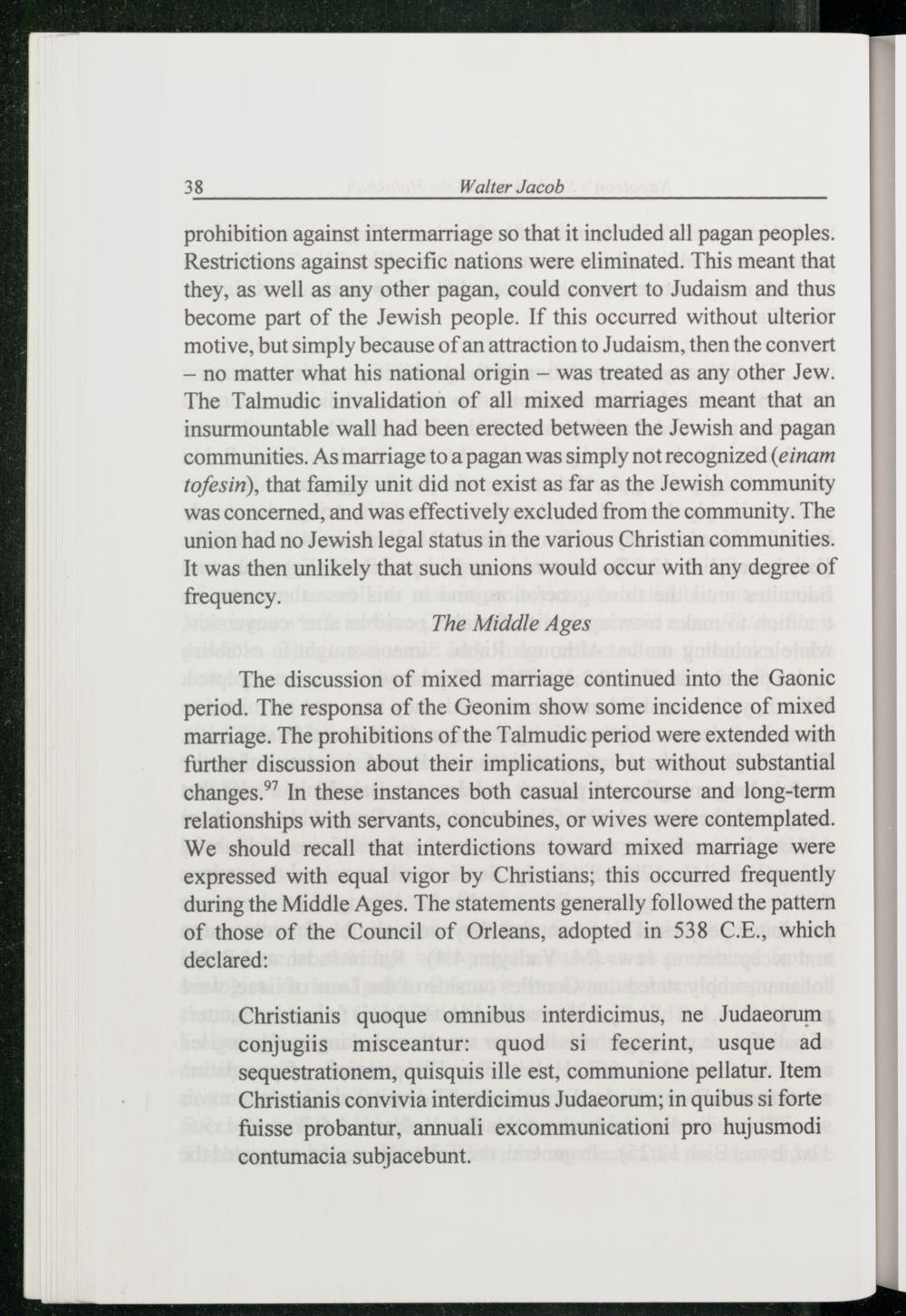 The discussion of mixed marriage continued into the Gaonic period. The responsa of the Geonim show some incidence of mixed marriage. The prohibitions of the Talmudic period were extended with further discussion about their implications, but without substantial changes.” In these instances both casual intercourse and long-term relationships with servants, concubines, or wives were contemplated. We should recall that interdictions toward mixed marriage were expressed with equal vigor by Christians; this occurred frequently during the Middle Ages. The statements generally followed the pattern of those of the Council of Orleans, adopted in 538 C.E., which declared: