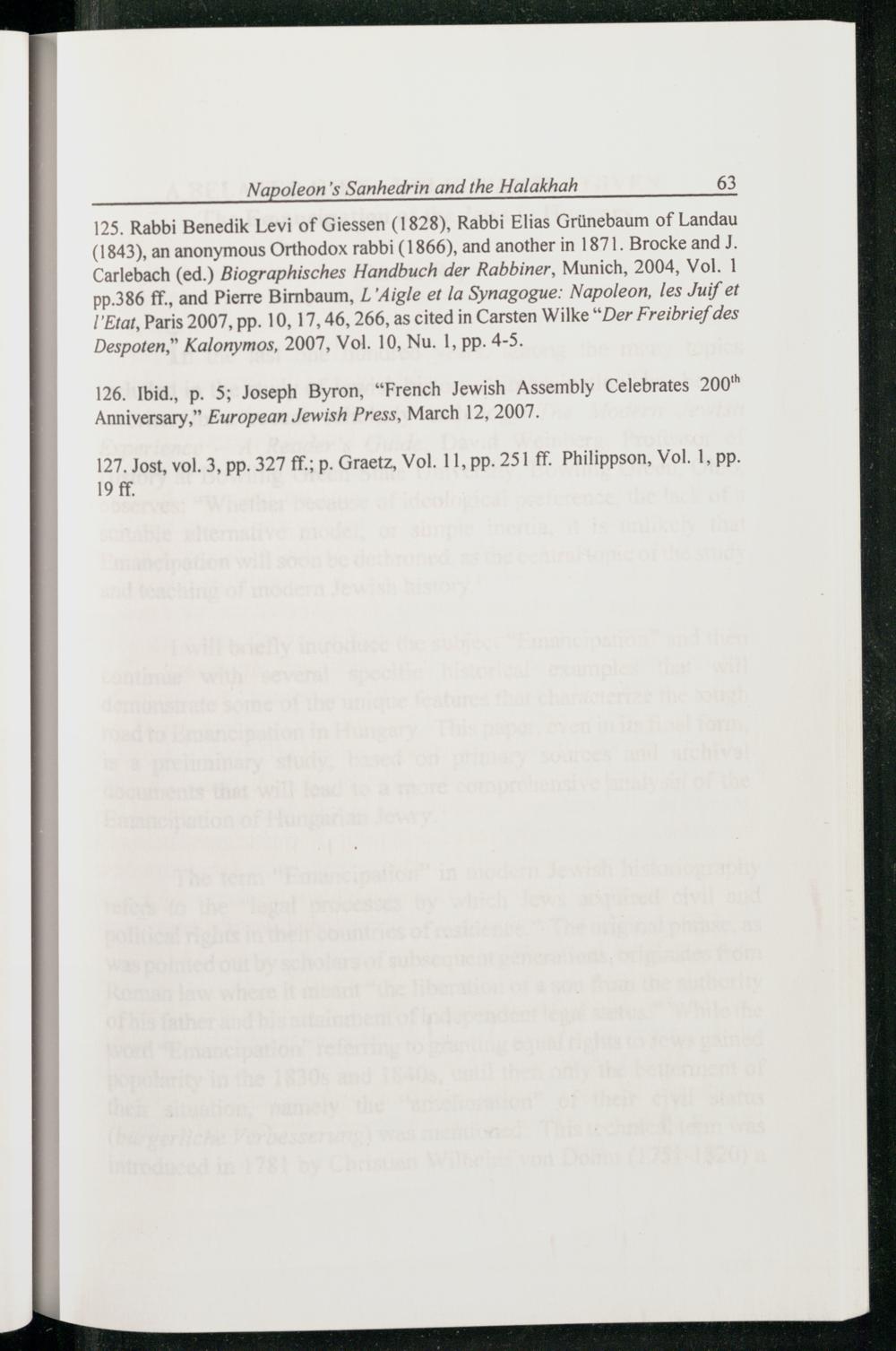 125. Rabbi Benedik Levi of Giessen(1828), Rabbi Elias Griinebaum of Landau (1843), an anonymous Orthodox rabbi (1866), and another in 1871. Brocke and J. Carlebach(ed.) Biographisches Handbuch der Rabbiner, Munich , 2004, Vol. 1 pp.386 ff., and Pierre Birnbaum , L Aigle et la Synagogue: Napoleon , les Juif et I’Etat, Paris 2007, pp. 10, 17, 46, 266, as cited in Carsten Wilke “Der Freibrief des Despoten,” Kalonymos, 2007, Vol. 10, Nu. 1, pp. 4-5.