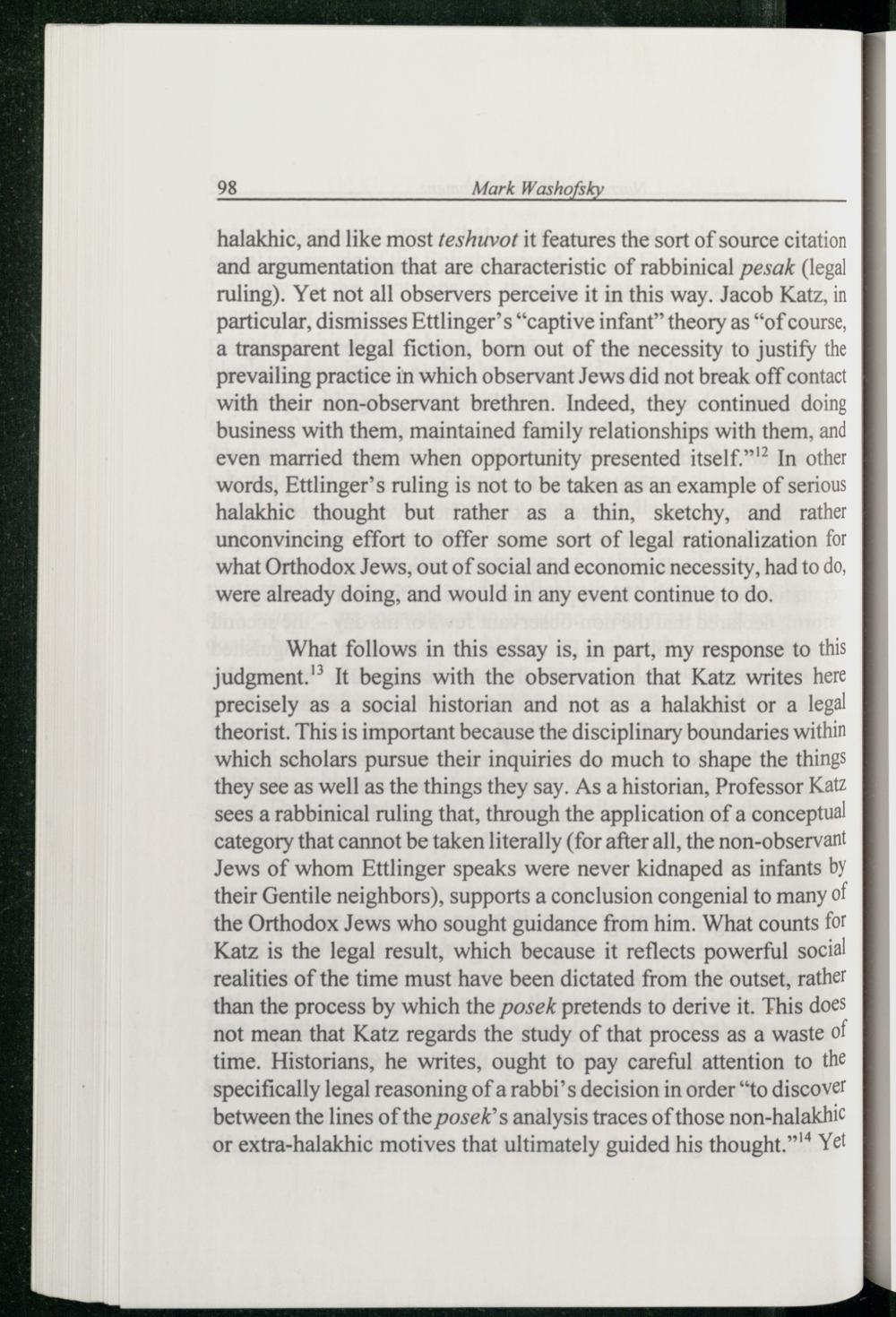 halakhic, and like most teshuvot it features the sort of source citation and argumentation that are characteristic of rabbinical pesak(legal ruling). Yet not all observers perceive it in this way. Jacob Katz , in particular, dismisses Ettlinger’s“captive infant” theory as“of course, a transparent legal fiction, born out of the necessity to justify the prevailing practice in which observant Jews did not break off contact with their non-observant brethren. Indeed, they continued doing business with them, maintained family relationships with them, and even married them when opportunity presented itself.”'* In other words, Ettlinger’s ruling is not to be taken as an example of serious halakhic thought but rather as a thin, sketchy, and rather unconvincing effort to offer some sort of legal rationalization for what Orthodox Jews , out of social and economic necessity, had to do, were already doing, and would in any event continue to do.