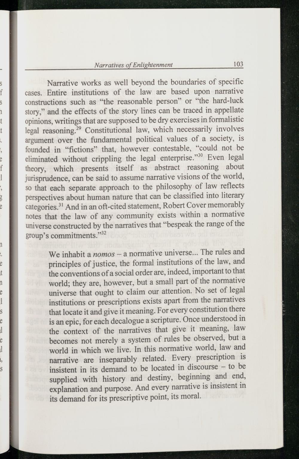 Narrative works as well beyond the boundaries of specific cases. Entire institutions of the law are based upon narrative constructions such as“the reasonable person” or“the hard-luck story,” and the effects of the story lines can be traced in appellate opinions, writings that are supposed to be dry exercises in formalistic legal reasoning.” Constitutional law, which necessarily involves argument over the fundamental political values of a society, is founded in“fictions” that, however contestable,“could not be eliminated without crippling the legal enterprise.” Even legal theory, which presents itself as abstract reasoning about jurisprudence, can be said to assume narrative visions of the world, so that each separate approach to the philosophy of law reflects perspectives about human nature that can be classified into literary categories.”! And in an oft-cited statement, Robert Cover memorably notes that the law of any community exists within a normative universe constructed by the narratives that“bespeak the range of the group’s commitments.”