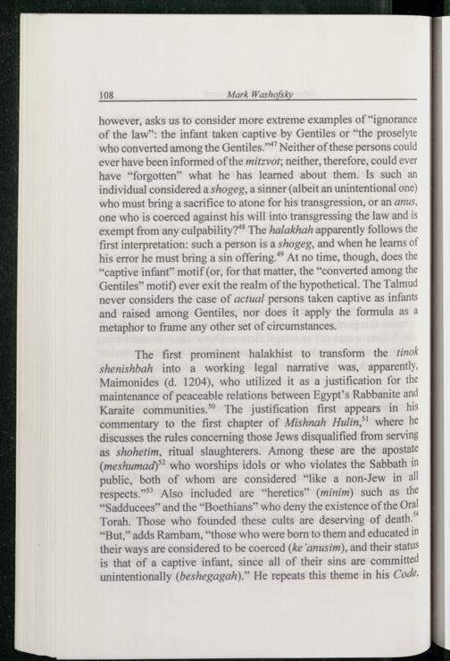 The first prominent halakhist to transform the tinok shenishbah into a working legal narrative was, apparently, Maimonides (d. 1204), who utilized it as a justification for the maintenance of peaceable relations between Egypt ’s Rabbanite and Karaite communities.” The justification first appears in his commentary to the first chapter of Mishnah Hulin,”' where he discusses the rules concerning those Jews disqualified from serving as shohetim, ritual slaughterers. Among these are the apostal¢ (meshumad)®® who worships idols or who violates the Sabbath in public, both of whom are considered“like a non-Jew in all respects.” Also included are“heretics”(minim) such as the “Sadducees” and the“Boethians” who deny the existence of the Oral Torah. Those who founded these cults are deserving of death.” “But,” adds Rambam ,“those who were born to them and educated in their ways are considered to be coerced(ke‘anusim), and their status is that of a captive infant, since all of their sins are committed unintentionally(beshegagah).” He repeats this theme in his Code,