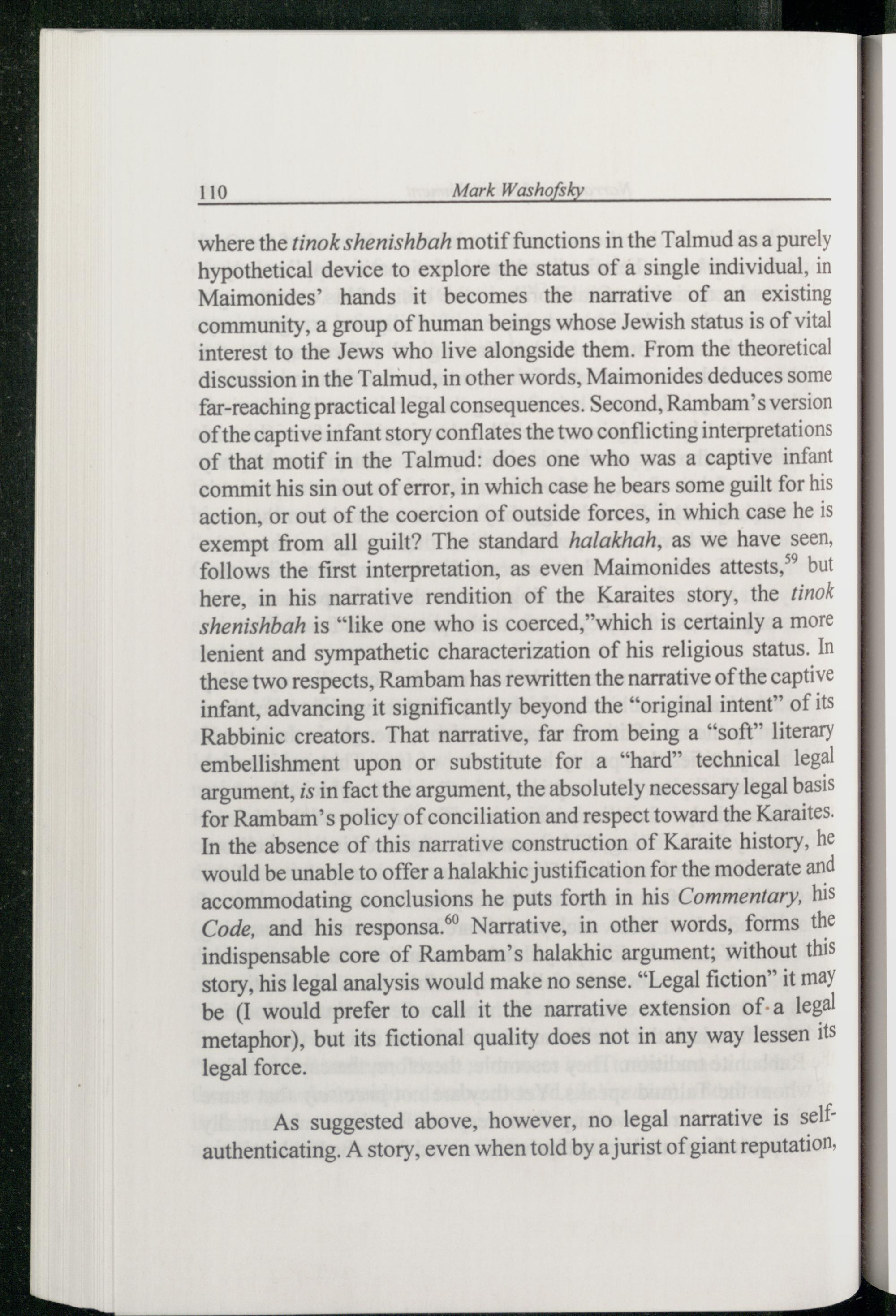 where the tinok shenishbah motif functions in the Talmud as a purely hypothetical device to explore the status of a single individual, in Maimonides ’ hands it becomes the narrative of an existing community, a group of human beings whose Jewish status is of vital interest to the Jews who live alongside them. From the theoretical discussion in the Talmud , in other words, Maimonides deduces some far-reaching practical legal consequences. Second, Rambam ’s version of the captive infant story conflates the two conflicting interpretations of that motif in the Talmud : does one who was a captive infant commit his sin out of error, in which case he bears some guilt for his action, or out of the coercion of outside forces, in which case he is exempt from all guilt? The standard halakhah, as we have seen, follows the first interpretation, as even Maimonides attests,” but here, in his narrative rendition of the Karaites story, the tinok shenishbah is“like one who is coerced, which is certainly a more lenient and sympathetic characterization of his religious status. In these two respects, Rambam has rewritten the narrative of the captive infant, advancing it significantly beyond the“original intent” of its Rabbinic creators. That narrative, far from being a“soft” literary embellishment upon or substitute for a“hard” technical legal argument, is in fact the argument, the absolutely necessary legal basis for Rambam ’s policy of conciliation and respect toward the Karaites . In the absence of this narrative construction of Karaite history, he would be unable to offer a halakhic justification for the moderate and accommodating conclusions he puts forth in his Commentary, his Code, and his responsa.®’ Narrative, in other words, forms the indispensable core of Rambam ’s halakhic argument; without this story, his legal analysis would make no sense.“Legal fiction” it may be(I would prefer to call it the narrative extension of-a legal metaphor), but its fictional quality does not in any way lessen its legal force.