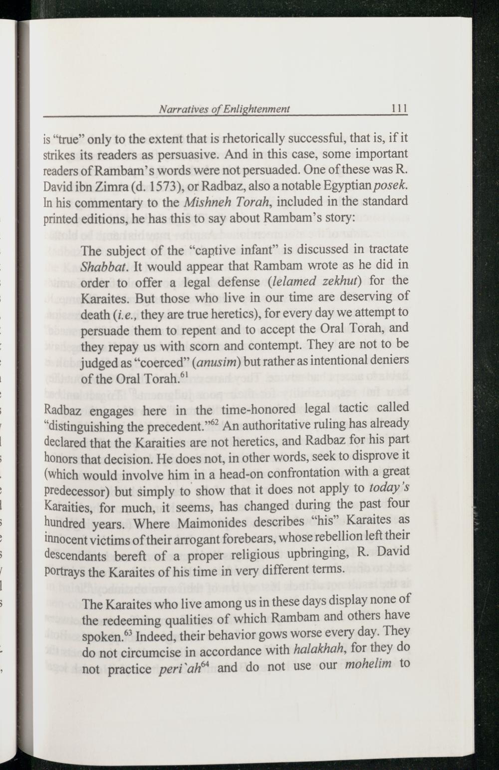 Radbaz engages here in the time-honored legal tactic called “distinguishing the precedent.”® An authoritative ruling has already declared that the Karaities are not heretics, and Radbaz for his part honors that decision. He does not, in other words, seek to disprove it (which would involve him in a head-on confrontation with a great predecessor) but simply to show that it does not apply to today’s Karaities, for much, it seems, has changed during the past four hundred years. Where Maimonides describes“his” Karaites as innocent victims of their arrogant forebears, whose rebellion left their descendants bereft of a proper religious upbringing, R. David portrays the Karaites of his time in very different terms.