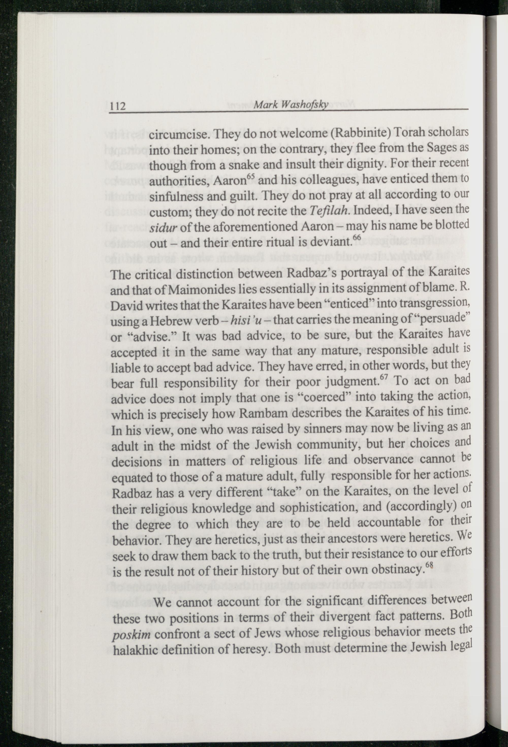 The critical distinction between Radbaz ’s portrayal of the Karaites and that of Maimonides lies essentially in its assignment of blame. R. David writes that the Karaites have been“enticed” into transgression, using a Hebrew verb— Aisi'u— that carries the meaning of“persuade” or“advise.” It was bad advice, to be sure, but the Karaites have accepted it in the same way that any mature, responsible adult is liable to accept bad advice. They have erred, in other words, but they bear full responsibility for their poor judgment.” To act on bad advice does not imply that one is“coerced” into taking the action, which is precisely how Rambam describes the Karaites of his time. In his view, one who was raised by sinners may now be living as an adult in the midst of the Jewish community, but her choices and decisions in matters of religious life and observance cannot be equated to those of a mature adult, fully responsible for her actions. Radbaz has a very different“take” on the Karaites , on the level of their religious knowledge and sophistication, and(accordingly) on the degree to which they are to be held accountable for their behavior. They are heretics, just as their ancestors were heretics. We seek to draw them back to the truth, but their resistance to our efforts is the result not of their history but of their own obstinacy.**
