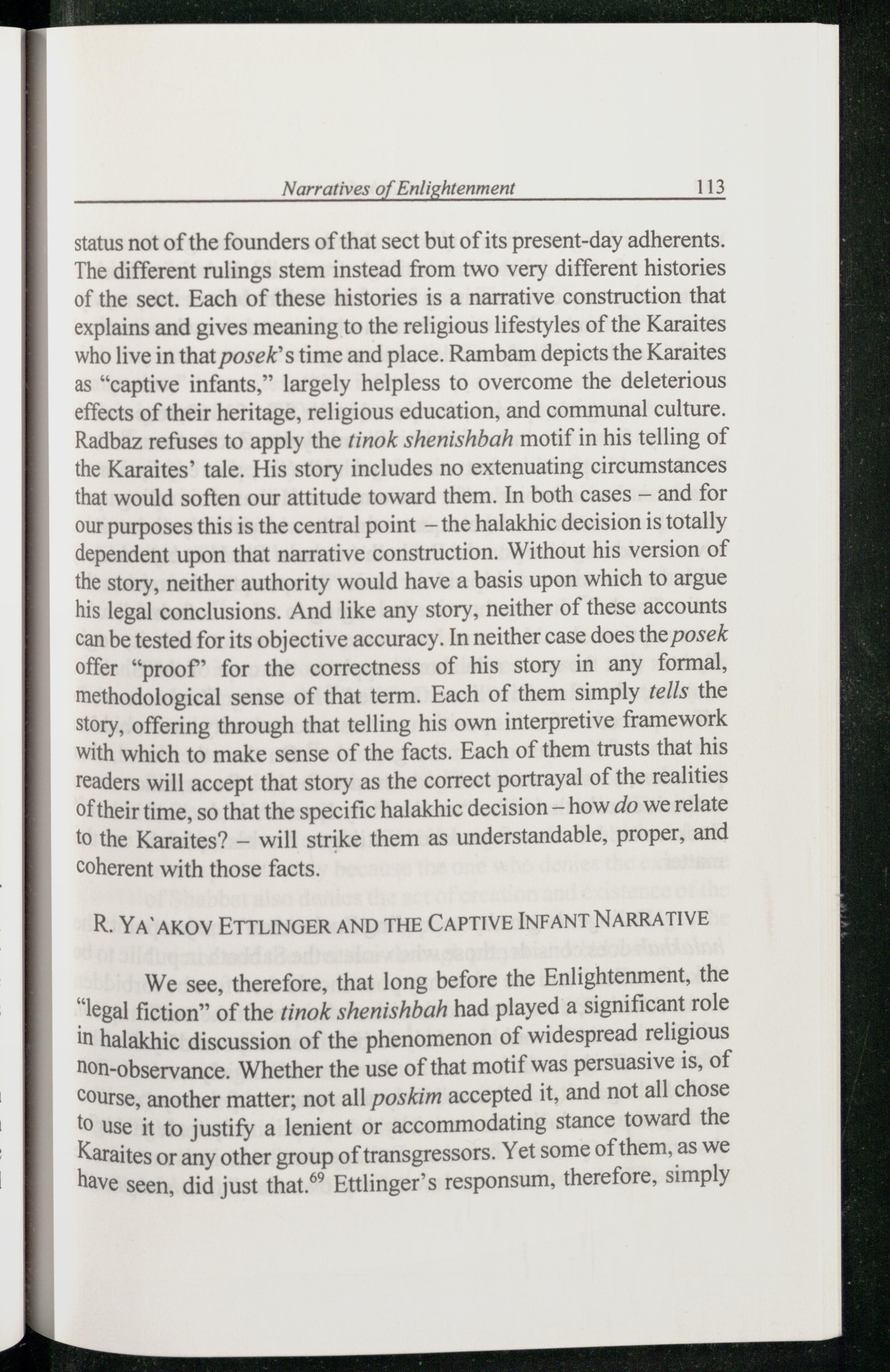 status not of the founders of that sect but of its present-day adherents. The different rulings stem instead from two very different histories of the sect. Each of these histories is a narrative construction that explains and gives meaning to the religious lifestyles of the Karaites who live in that posek’s time and place. Rambam depicts the Karaites as“captive infants,” largely helpless to overcome the deleterious effects of their heritage, religious education, and communal culture. Radbaz refuses to apply the tinok shenishbah motif in his telling of the Karaites ’ tale. His story includes no extenuating circumstances that would soften our attitude toward them. In both cases— and for our purposes this is the central point— the halakhic decision is totally dependent upon that narrative construction. Without his version of the story, neither authority would have a basis upon which to argue his legal conclusions. And like any story, neither of these accounts can be tested for its objective accuracy. In neither case does the posek offer“proof” for the correctness of his story in any formal, methodological sense of that term. Each of them simply tells the story, offering through that telling his own interpretive framework with which to make sense of the facts. Each of them trusts that his readers will accept that story as the correct portrayal of the realities of their time, so that the specific halakhic decision—how do we relate to the Karaites ?— will strike them as understandable, proper, and coherent with those facts.