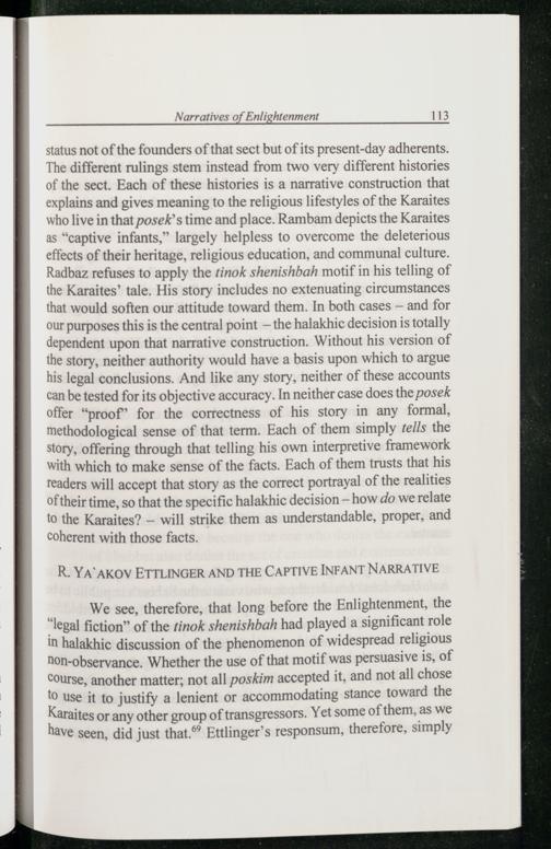 We see, therefore, that long before the Enlightenment , the “legal fiction” of the tinok shenishbah had played a significant role in halakhic discussion of the phenomenon of widespread religious non-observance. Whether the use of that motif was persuasive is, of course, another matter; not all poskim accepted it, and not all chose to use it to justify a lenient or accommodating stance toward the Karaites or any other group of transgressors. Yet some of them, as we have seen, did just that. Ettlinger’s responsum, therefore, simply