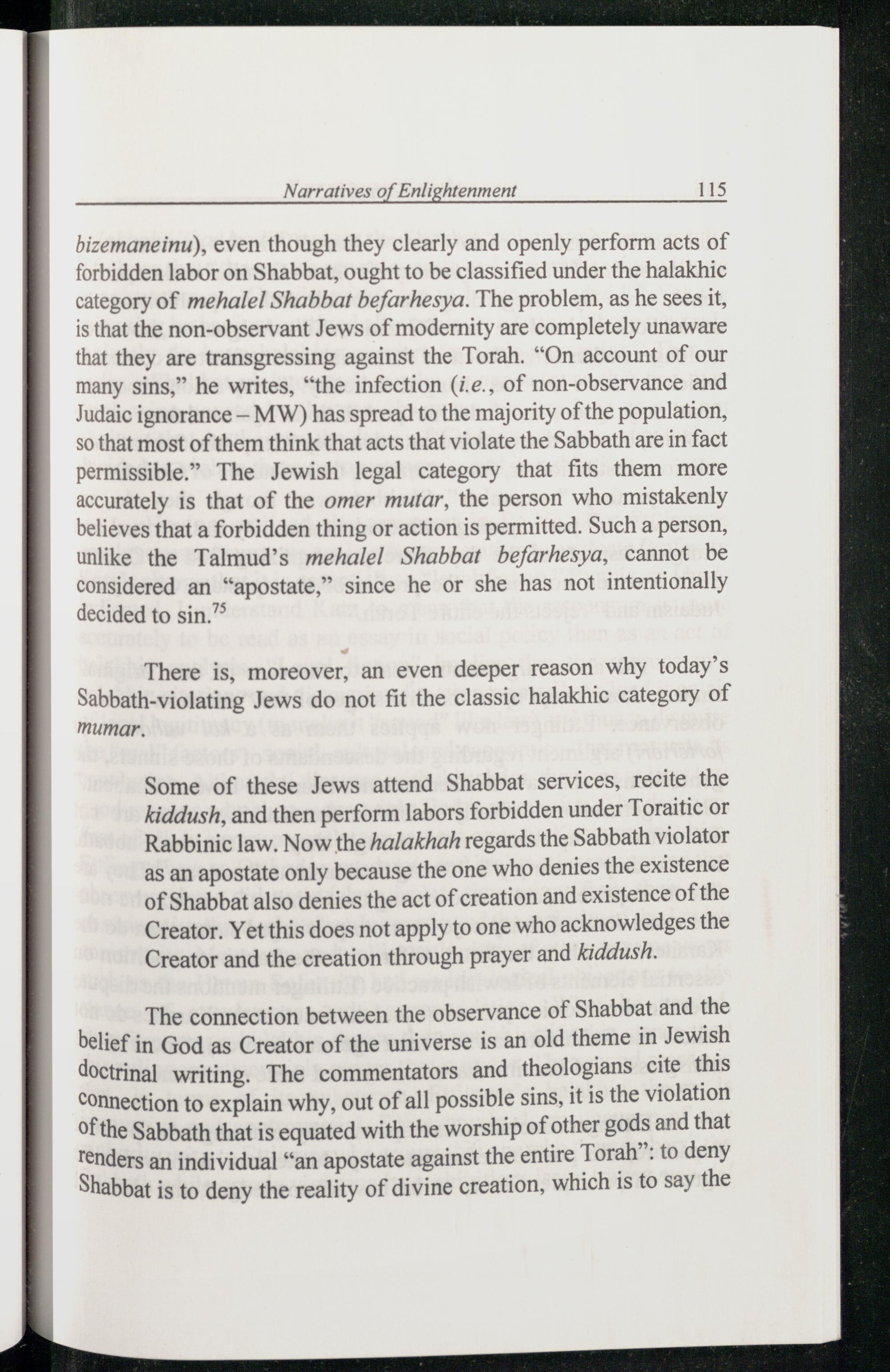 bizemaneinu), even though they clearly and openly perform acts of forbidden labor on Shabbat , ought to be classified under the halakhic category of mehalel Shabbat befarhesya. The problem, as he sees it, is that the non-observant Jews of modernity are completely unaware that they are transgressing against the Torah. “On account of our many sins,” he writes,“the infection(i.e., of non-observance and Judaic ignorance— MW) has spread to the majority of the population, so that most of them think that acts that violate the Sabbath are in fact permissible.” The Jewish legal category that fits them more accurately is that of the omer mutar, the person who mistakenly believes that a forbidden thing or action is permitted. Such a person, unlike the Talmud ’s mehalel Shabbat befarhesya, cannot be considered an“apostate,” since he or she has not intentionally decided to sin.”